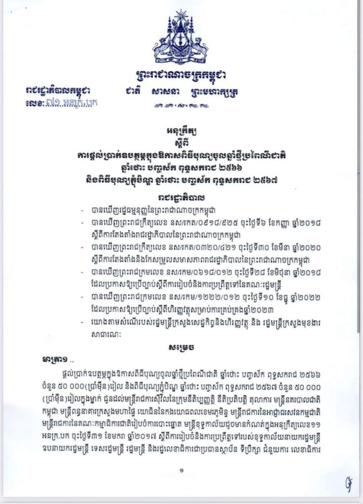 ភ្នំពេញ៖ រាជរដ្ឋាភិបាល បានប្រកាសផ្ដល់ប្រាក់ឧបត្ថម្ភជូនមន្ត្រីរាជការ ប្រាំ ម៉ឺន រៀល ក្នុងឱកាសចូលឆ្នាំថ្មីប្រពៃណីជាតិ និងពិធីបុណ្យភ្ជុំបិណ្ឌ។ នេះបើ យោងតាមអនុក្រឹត្យស្តីពីការផ្តល់ប្រាក់ឧបត្ថម្ភក្នុងឱកាសពិធីបុណ្យចូលឆ្នាំថ្មីប្រពៃណីជាតិ ឆ្នាំថោះ បញ្ចស័ក ពុទ្ធសករាជ ២៥៦៦ និងពិធីបុណ្យភ្ជុំបិណ្ឌ ឆ្នាំថោះ បញ្ចស័ក ពុទ្ធសករាជ ២៥៦៧ ដែលទទួលបាននៅថ្ងៃទី០១ ខែមេសា ឆ្នាំ២០២៣ ។