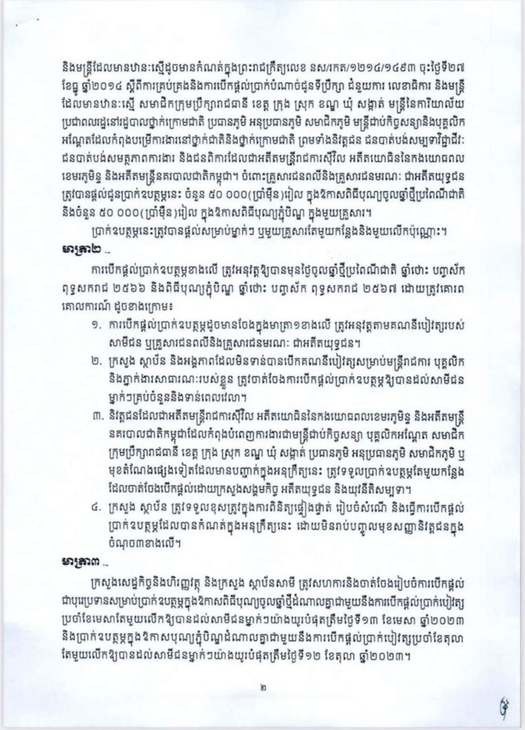 មាត្រា១៖ ផ្ដល់ប្រាក់ឧបត្ថម្ភក្នុងឱកាសពិធីបុណ្យចូលឆ្នាំថ្មីប្រពៃណីជាតិ ឆ្នាំថោះ បញ្ចស័ក ពុទ្ធសករាជ ២៥៦៦ ចំនួន ៥០ ០០០(ប្រាំម៉ឺន)រៀល និងពិធីបុណ្យភ្ជុំបិណ្ឌ ឆ្នាំថោះ បញ្ចស័ក ពុទ្ធសករាជ ២៥៦៧ ចំនួន ៥០ ០០០ (ប្រាំម៉ឺន)រៀលក្នុងម្នាក់ ជូនដល់មន្ត្រីរាជការស៊ីវិលនៃក្រុមនីតិប្បញ្ញត្តិ នីតិប្រតិបត្តិ តុលាការ មន្ត្រីនគរបាលជាតិ កម្ពុជា មន្ត្រីពន្ធនាគារ ក្រសួង មហាផ្ទៃ យោធិននៃកងយោធពលខេមរភូមិន្ទ មន្រ្តីរាជការនៃអាជ្ញាធរ សវនកម្មជាតិ មន្ត្រីរាជការនៃគណៈកម្មាធិការជាតិរៀបចំការបោះឆ្នោត និងការបើកផ្ដល់ប្រាក់បំណាច់ជូនទីប្រឹក្សា ជំនួយការលេខាធិការ និងមន្ត្រី ដែលមានឋានៈស្មើ សមាជិកក្រុមប្រឹក្សារាជធានី ខេត្ត ក្រុង ស្រុក ខណ្ឌ ឃុំ សង្កាត់ មន្ត្រីនៃការិយាល័យ ប្រជាពលរដ្ឋនៅរដ្ឋបាលថ្នាក់ក្រោមជាតិ ប្រធានភូមិ អនុប្រធានភូមិ សមាជិកភូមិ មន្ត្រីជាប់កិច្ចសន្យានិងបុគ្គលិក អណ្តែតដែលកំពុងបម្រើការងារនៅថ្នាក់ជាតិនិងថ្នាក់ក្រោមជាតិ ព្រមទាំងនិវត្តន៍ជន ជនបាត់បង់សម្បទាវិជ្ជាជីវៈ ជនបាត់បង់សមត្ថភាព ការងារ និងជនពិការដែលជាអតីតមន្រ្តីរាជការស៊ីវិល អតីតយោធិននៃ កងយោធពល ខេមរភូមិន្ទ និងអតីតមន្ត្រីនគរបាលជាតិកម្ពុជា។ ចំពោះគ្រួសារជនពលី និងគ្រួសារជនមរណៈ ជាអតីតយុទ្ធជន ត្រូវបានផ្ដល់ជូនប្រាក់ឧបត្ថម្ភនេះ ចំនួន ៥០ ០០០(ប្រាំម៉ឺន)រៀល ក្នុងឱកាសពិធីបុណ្យចូលឆ្នាំថ្មីប្រពៃណីជាតិ និងចំនួន ៥០ ០០០ (ប្រាំម៉ឺន)រៀល ក្នុងឱកាសពិធីបុណ្យភ្ជុំបិណ្ឌ ក្នុងមួយគ្រួសារ។ ប្រាក់ឧបត្ថម្ភនេះត្រូវបានផ្ដល់សម្រាប់ម្នាក់ៗ ឬមួយគ្រួសារតែមួយ កន្លែងនិងមួយលើកប៉ុណ្ណោះ។