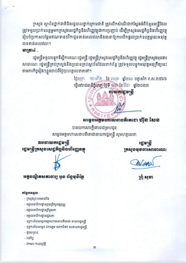 មាត្រា៣៖ ក្រសួងសេដ្ឋកិច្ចនិងហិរញ្ញវត្ថុ និងក្រសួង ស្ថាប័នសាមី ត្រូវសហការ និងចាត់ចែងរៀបចំការបើកផ្ដល់ ជាបុរេប្រទានសម្រាប់ប្រាក់ ឧបត្ថម្ភក្នុងឱកាសពិធីបុណ្យចូលឆ្នាំថ្មីដំណាលគ្នាជាមួយនឹងការបើកផ្តល់ប្រាក់បៀវត្ស ប្រចាំខែមេសាតែមួយលើកឱ្យបានដល់សាមីជនម្នាក់ៗ យ៉ាងយូរ បំផុតត្រឹមថ្ងៃទី១៣ ខែមេសា ឆ្នាំ២០២៣ និងប្រាក់ឧបត្ថម្ភក្នុងឱកាស បុណ្យភ្ជុំបិណ្ឌ ដំណាលគ្នាជាមួយនឹងការបើកផ្ដល់ប្រាក់បៀវត្សប្រចាំខែតុលា តែមួយលើកឱ្យបានដល់សាមីជនម្នាក់ៗយ៉ាងយូរបំផុតត្រឹមថ្ងៃទី១២ ខែតុលា ឆ្នាំ២០២៣។