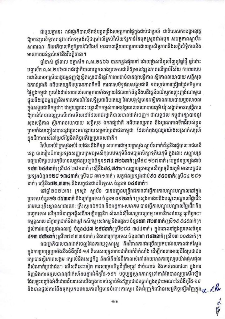 ជាមួយគ្នានេះ រាជរដ្ឋាភិបាលខិតខំបន្ដពង្រឹងសមត្ថភាពផ្ទៃក្នុងជាប់ជាប្រចាំ ជាពិសេសការបន្ដអនុវត្តឲ្យមានប្រសិទ្ធភាពនូវការកែទម្រង់ស៉ីជម្រៅលើគ្រប់វិស័យ ឲ្យកាន់តែមុតស្រួចជាងមុន សមត្ថភាពស្ថាប័នសាធារណៈ និងអភិបាលកិច្ចឲ្យកាន់តែរឹងមាំ មានភាពឆ្លើយតបប្រកបដោយប្រសិទ្ធភាព និងសក្ដិសិទ្ធិភាព និងមានភាពធន់ខ្ពស់ទៅនឹងវិបត្តិនានា ។