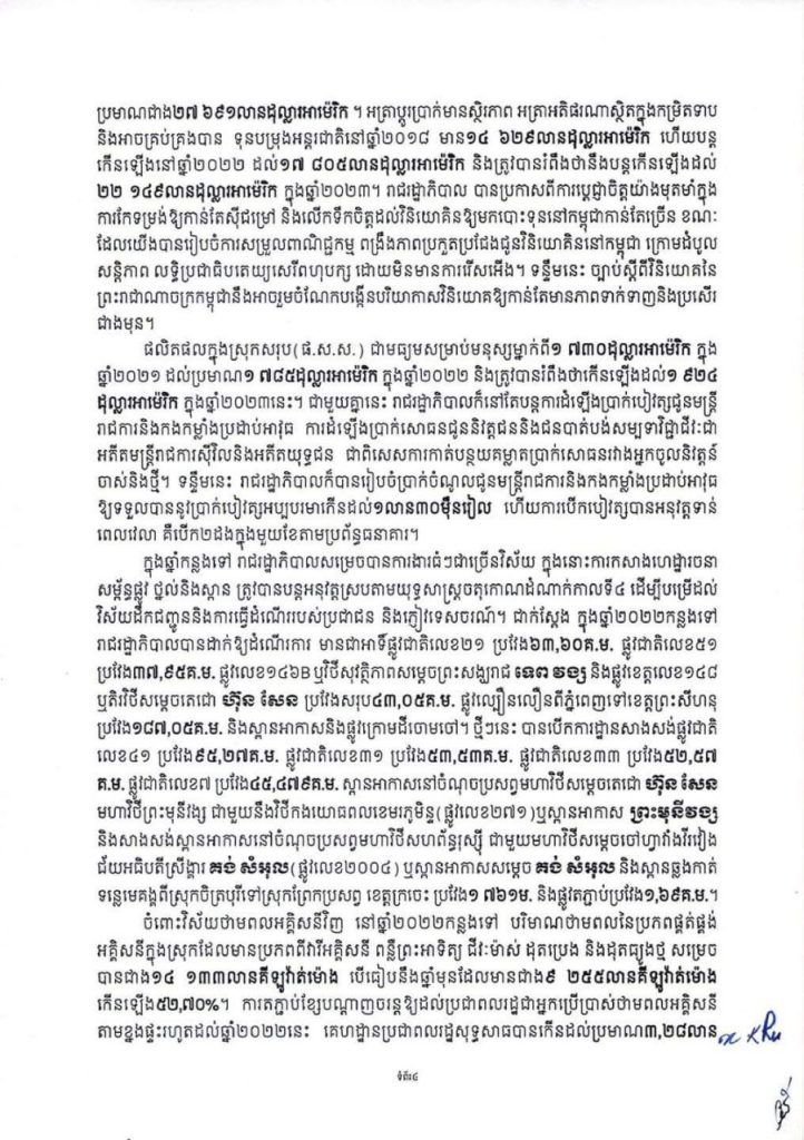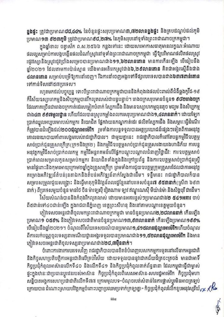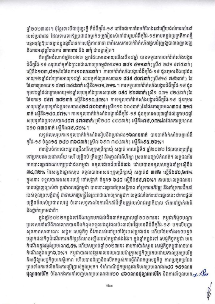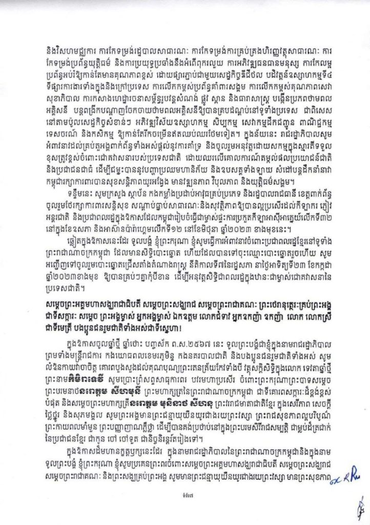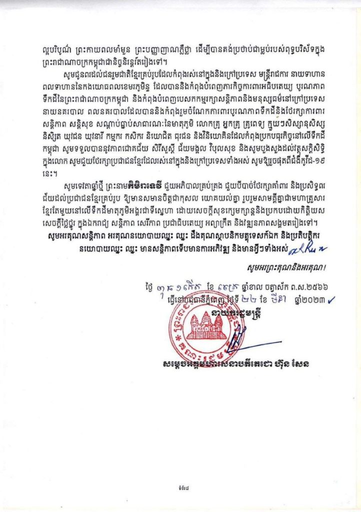 សារលិខិតនេះ សម្ដេចតេជោ ហ៊ុន សែន បានកត់សម្គាល់ថា ពិធីបុណ្យចូលឆ្នាំថ្មីប្រពៃណីជាតិខ្មែរ ឆ្នាំថោះនេះ ជាឆ្នាំចុងក្រោយនៃអាណត្តិរបស់រាជរដ្ឋាភិបាល នីតិកាលទី៦ នៃរដ្ឋសភា ដែលបានខិតខំបន្ដអនុវត្តកម្មវិធីនយោបាយ និងយុទ្ធសាស្ដ្រចតុកោណដំណាក់កាលទី៤ ដែលបានដាក់ចេញកាលពីខែកញ្ញា ឆ្នាំ២០១៨ សម្រេចបានសមិទ្ធផលធំៗថ្មីៗ យ៉ាងច្រើនប្រកបដោយមោទនភាព។