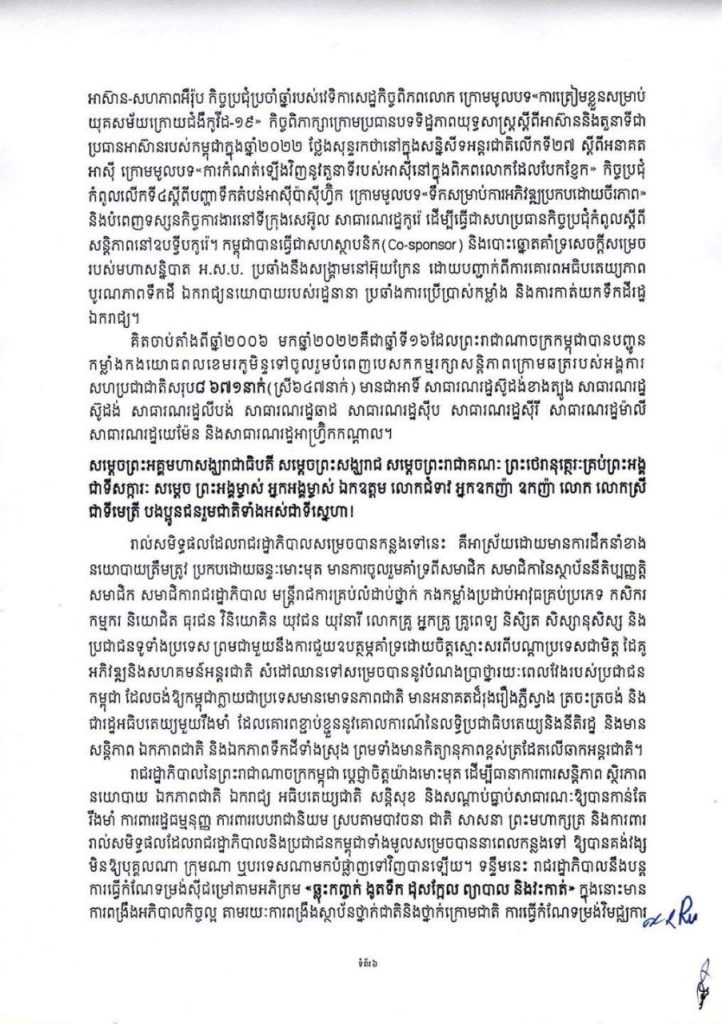 សម្ដេច បានបន្ដទៀតថា រាជរដ្ឋាភិបាល នីតិកាលទី៦ នៃរដ្ឋសភា ដែលប្រសូត្រចេញពីការបោះឆ្នោតដោយភាពសេរី ត្រឹមត្រូវ យុត្តិធម៌ និងតម្លាភាព ស្របតាមគោលការណ៍នៃលទ្ធិប្រជាធិបតេយ្យសេរីពហុបក្ស និងបានទទួលការគាំទ្រ និងជំនឿទុកចិត្តពីប្រជាពលរដ្ឋដ៏ច្រើនលើសលប់ កំពុងបន្ដបេសកកម្មដ៏ឧត្ដុង្គឧត្តមជាប្រវត្តិសាស្ដ្ររបស់ខ្លួន ជាមួយនឹងការប្ដេជ្ញាចិត្តយ៉ាងមុតមាំឥតរាថយ និងកាន់តែស្វាហាប់ទ្វេដងក្នុងការបម្រើប្រជាជន ។