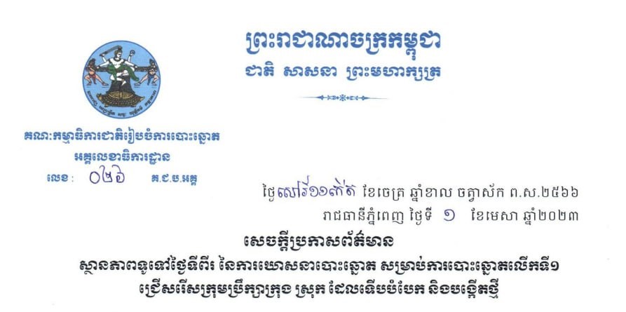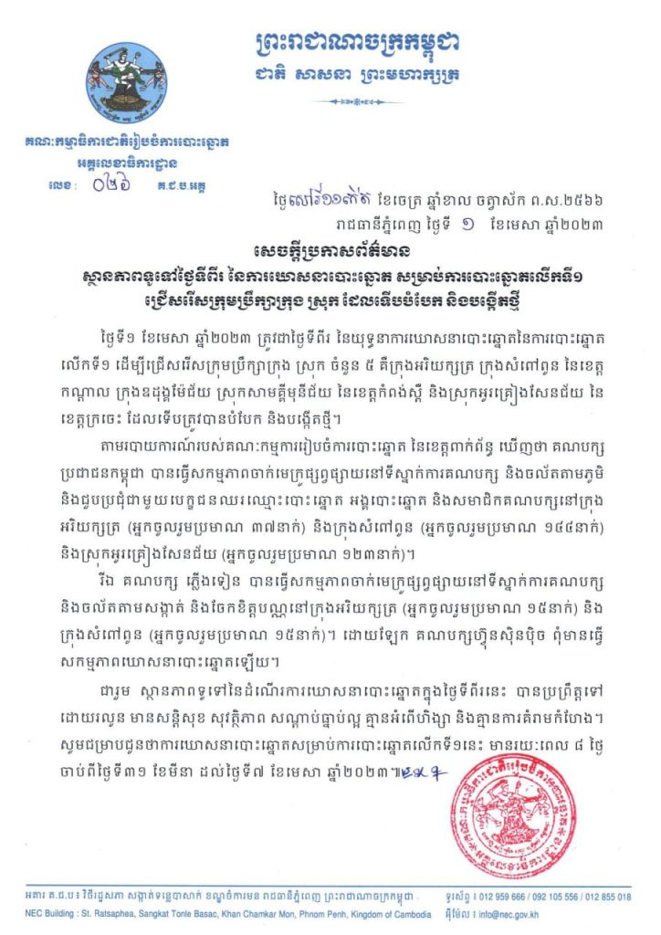 មានរយៈពេល ៨ ថ្ងៃ ចាប់ពីថ្ងៃទី៣១ ខែមីនា ដល់ថ្ងៃទី៧ ខែមេសា ឆ្នាំ២០២៣ និងការបោះឆ្នោតនឹងប្រព្រឹត្តិទៅនៅថ្ងៃអាទិត្យទី ៩ ខែមេសា ឆ្នាំ ២០២៣។ ការបោះឆ្នោតនេះ មានគណបក្សនយោបាយចូលរួមប្រកួតប្រជែង គឺគណបក្សហ៊ុនស៊ិនប៉ិច គណបក្សភ្លើងទៀន និងគណបក្សប្រជាជនកម្ពុជា៕