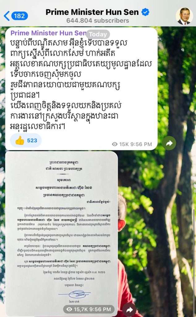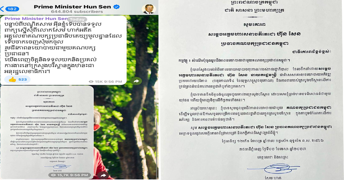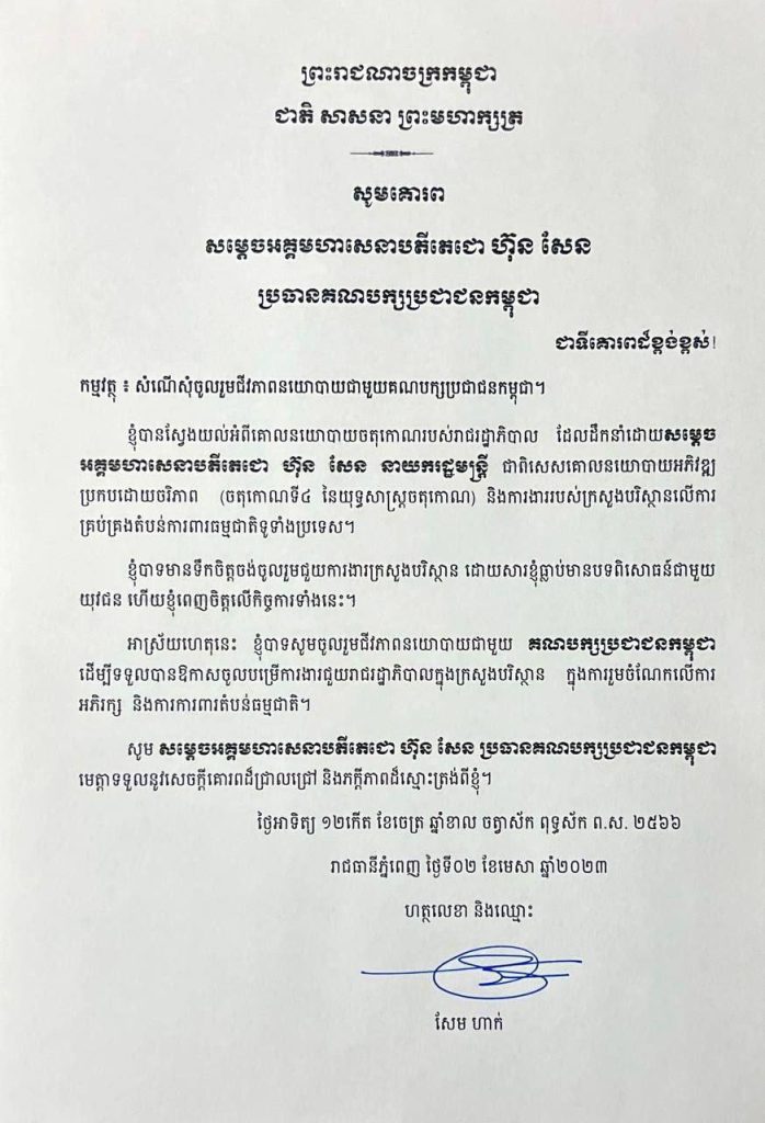 លោក សែម ហាក់ ធ្វើលិខិតគោរពជូនសម្តេចតេជោ ហ៊ុន សែន សុំចូលរួមជីវភាពនយោបាយជាមួយគណបក្សប្រជាជនកម្ពុជា។ លោក សែម ហាក់ បានធ្វើលិខិតគោរពជូនសម្តេចអគ្គមហាសេនាបតីតេជោ ហ៊ុន សែន ប្រធានគណបក្សប្រជាជនកម្ពុជា នៅថ្ងៃទី២ ខែមេសា ឆ្នាំ២០២៣នេះ ស្នើសុំចូលរួមជីវភាពនយោបាយជាមួយគណបក្សប្រជាជនកម្ពុជា។