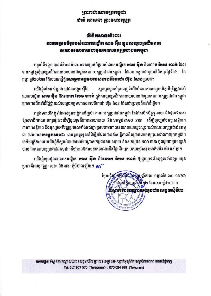 យុវជនសង្គមស៊ីវិលសាទរចំពោះការសម្រេចចិត្តរបស់លោកបណ្ឌិត សាម អ៊ីន និងលោក សែម ហាក់
