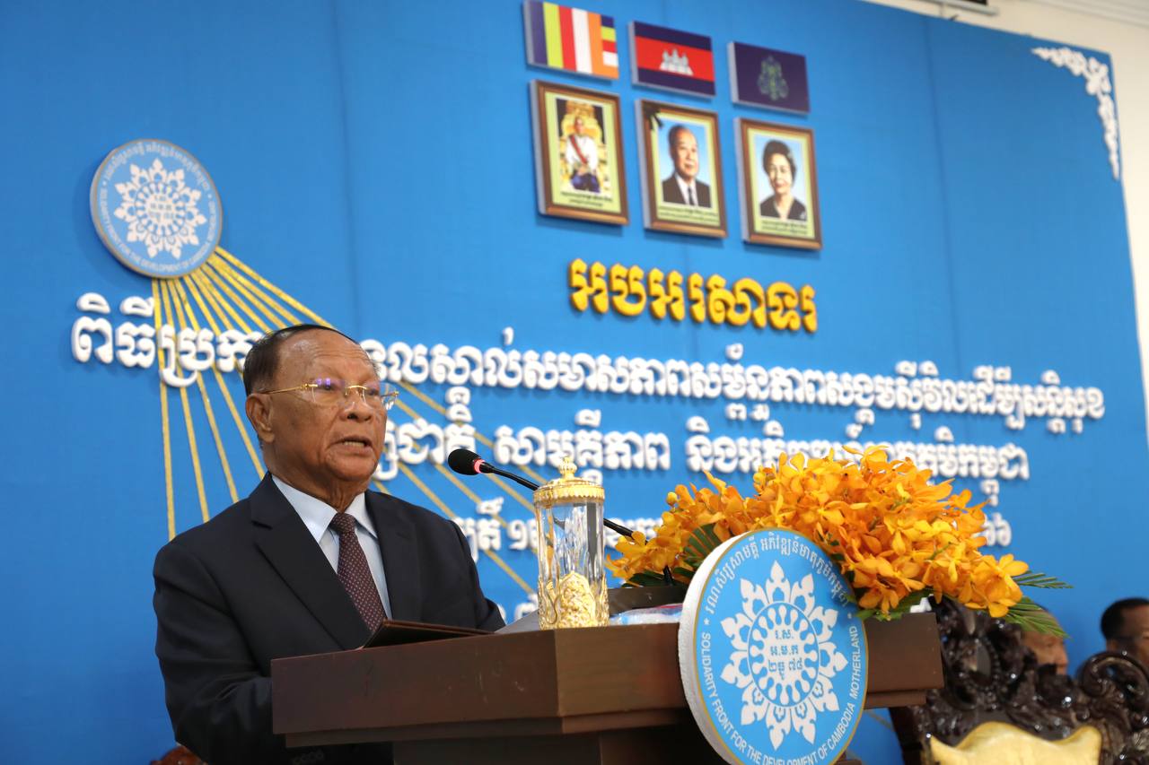 ភ្នំពេញ ៖ សម្តេចអគ្គមហាពញាចក្រី ហេង សំរិន ប្រធានរដ្ឋសភា ប្រធានកិត្តិយសគណ បក្ស ប្រជាជនកម្ពុជា និងជាប្រធានក្រុមប្រឹក្សាជាតិរណសិរ្សសាមគ្គី អភិវឌ្ឍន៍មាតុភូមិកម្ពុជា បានអញ្ជើញជាអធិបតីភាពដ៏ខ្ពង់ខ្ពស់ក្នុងពិធីប្រកាសទទួលស្គាល់សមាសភាពសម្ព័ន្ធភាពសង្គមស៊ីវិល ដើម្បីសន្តិសុខមនុស្សជាតិ សាមគ្គីភាព និងអភិវឌ្ឍន៍មាតុភូមិកម្ពុជា កាលពី រសៀលថ្ងៃទី៦ ខែមេសា ឆ្នាំ២០២៣ នៅវិមាន៧មករា។