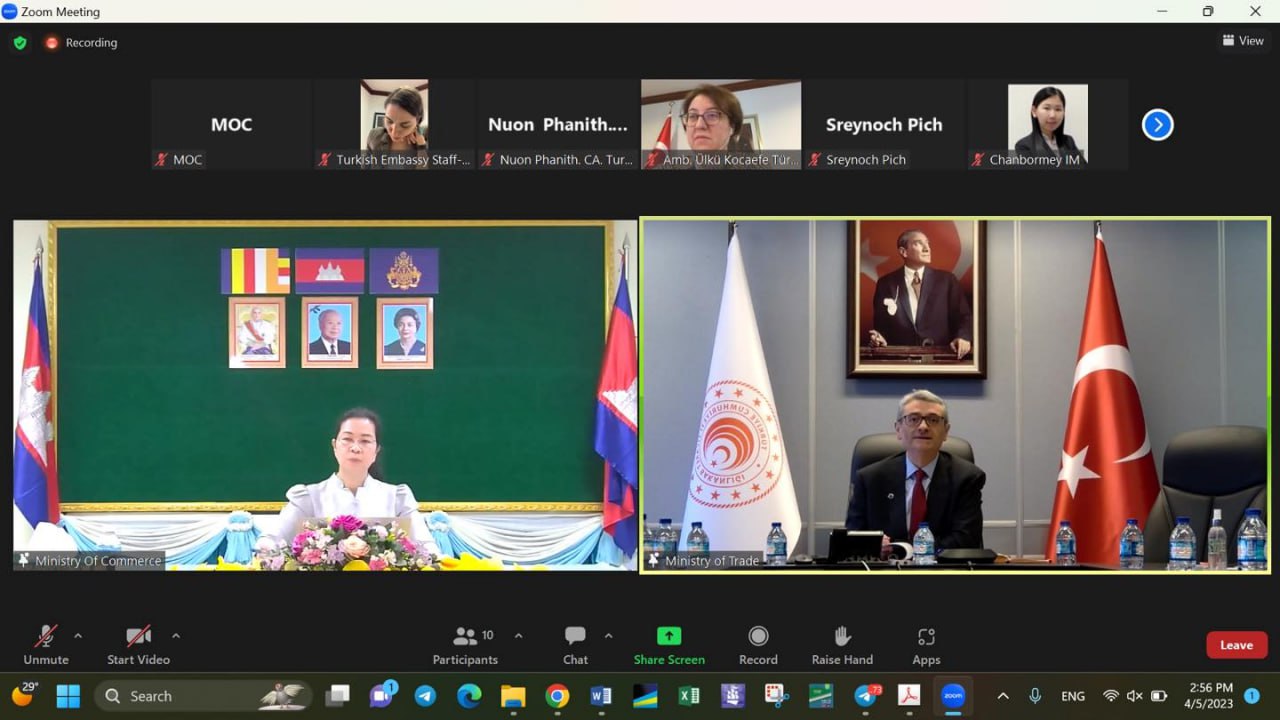 ជំនួបនេះធ្វើឡើងតាមរយៈប្រព័ន្ធវីដេអូកាលពីថ្ងៃទី៥ខែមេសា រវាងលោកជំទាវ តឹករ៉េត កំរង រដ្ឋលេខាធិការក្រសួងពាណិជ្ជកម្ម បានទទួលជួបពិភាក្សាការងារជាមួយលោក Hüsnü Dilemre អគ្គនាយកទទួលបន្ទុកកិច្ចព្រមព្រៀងអន្តរជាតិនិងកិច្ចការសហភាពអឺរ៉ុបនៃក្រសួងពាណិជ្ជកម្មតួកគី និងមានវត្តមានចូលរួមពីលោកស្រី Ülkü Kocaefe ឯកអគ្គរដ្ឋទូតតួកគីប្រចាំកម្ពុជា ថ្នាក់ដឹកនាំ និងមន្រ្តីជំនាញរបស់ភាគីទាំងពីរ។ នេះបើតាមប្រភពក្រសួងពាណិជ្ជកម្ម។