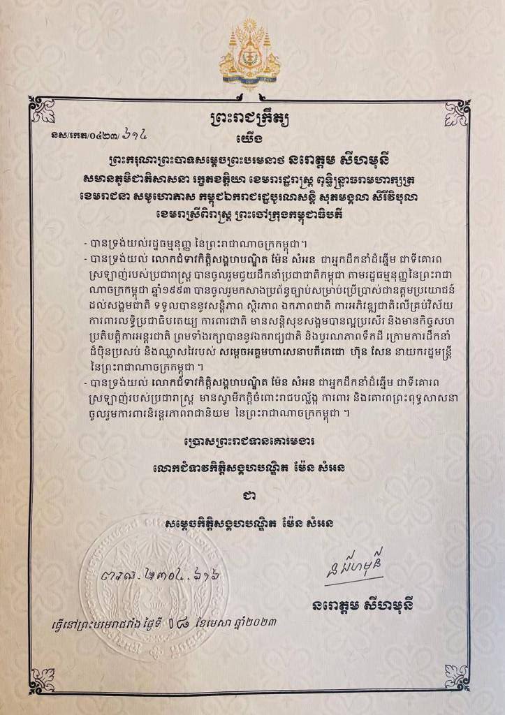 ព្រះមហាក្សត្រកម្ពុជាប្រោសប្រទានគោរមងារ «សម្ដេច» ជូនលោកជំទាវកិត្តិសង្គហបណ្ឌិត ម៉ែន សំអន