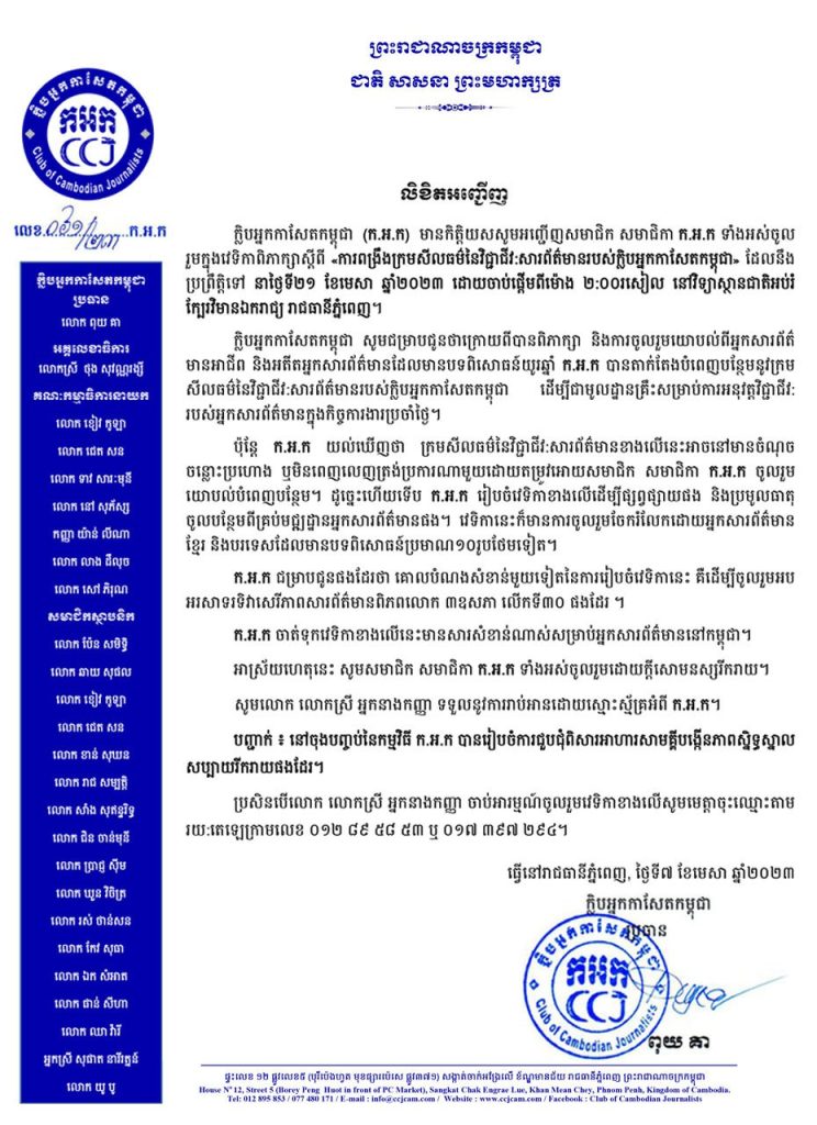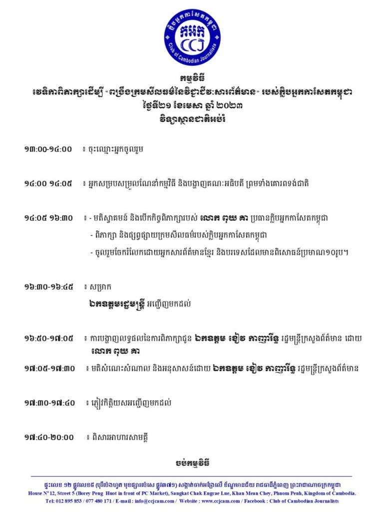 ក្លឹបអ្នកកាសែតកម្ពុជានឹងរៀបចំវេទិកាពិភាក្សាស្ដីពី “ការពង្រឹងក្រមសីលធម៌នៃវិជ្ជាជីវ:សារព័ត៌មានរបស់ក្លិបអ្នកកាសែតកម្ពុជា” នៅវិទ្យាស្ថានជាតិអប់រំ ថ្ងៃទី២១ មេសា ២០២៣One-Minuteអត្ថបទដោយ៖AMS OneMinute #ams1minute AMS OneMinuteអត្ថបទមុនអត្ថបទបន្ទាប់