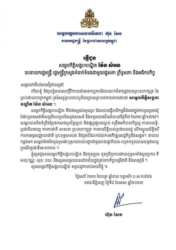 ខ្ញុំសូមជូនពរសម្ដេចកិត្តិសង្គហបណ្ឌិត និងកូនប្រុស កូនស្រីប្រកបដោយពុទ្ធពរទាំងបួនប្រការ គឺ អាយុ វណ្ណៈ សុខៈ ពលៈ និងសូមសម្រេចបានជោគជ័យក្នុងគ្រប់ភារកិច្ចបម្រើជាតិ និងមាតុភូមិ ។ សូមសម្ដេចកិត្តិសង្គហបណ្ឌិត ទទួលនូវការរាប់អានពីខ្ញុំ ៕