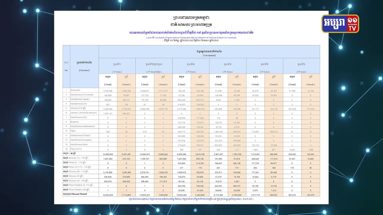 កម្ពុជាបានចាប់ផ្តើមចាក់ដូសជំរុញទី៦ ចាប់តាំងពីដើមខែមករា ដែលរហូតមកទល់ពេលនេះ មានពលរដ្ឋទៅចាក់បានចំនួន ៣៥ម៉ឺន ២ពាន់ ៨១០នាក់ហើយ។ ដោយឡែកតួលេខ នៃការចាក់វ៉ាក់សាំងដូសមូលដ្ឋានទូទាំងប្រទេសកម្ពុជាមានជិត ៩៦ភាគរយ។