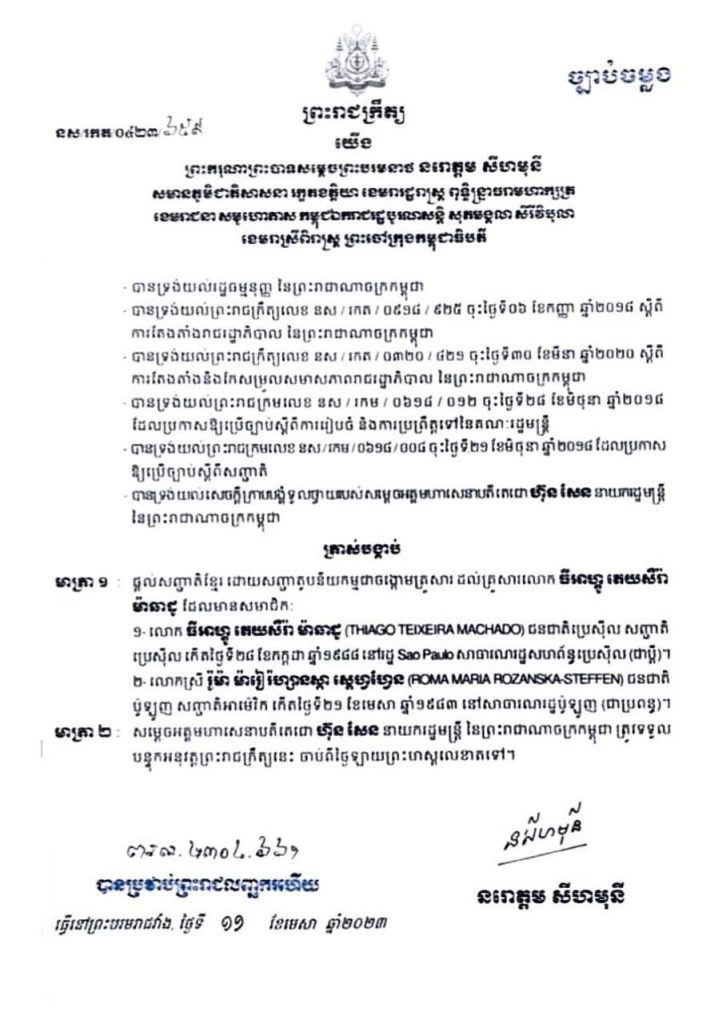 ភ្នំពេញ៖ ព្រះករុណា ព្រះបាទ សម្ដេចព្រះបរមនាថ នរោត្តម សីហមុនី ព្រះមហាក្សត្រនៃព្រះរាជាណាចក្រកម្ពុជា ស្ដេចទ្រង់សព្វព្រះរាជហឫទ័យ ឡាយព្រះហត្តលេខានៅថ្ងៃទី១១ ខែមេសា ឆ្នាំ២០២៣ លើព្រះរាជក្រឹត្យប្រោសប្រទានសញ្ជាតិខ្មែរដល់កីឡាករ Thiago ជនជាតិបេស៊ីល និងភរិយាជនជាតិប៉ូឡូញ ។