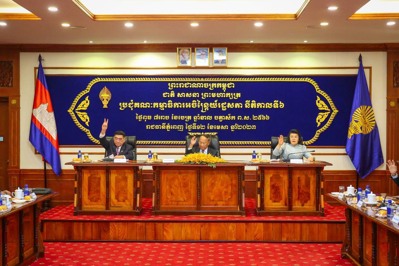 ភ្នំពេញ៖ សម្ដេចអគ្គមហាពញាចក្រី ហេង សំរិន ប្រធានរដ្ឋសភា នៃព្រះរាជាណាចក្រកម្ពុជា បានដឹកនាំកិច្ចប្រជុំគណៈកម្មាធិការអចិន្ត្រៃយ៍រដ្ឋសភា កាលពីព្រឹកថ្ងៃទី១២ ខែមេសា ឆ្នាំ២០២៣ ដើម្បីធ្វើការពិភាក្សាកំណត់កាលបរិច្ឆេទបន្តសម័យប្រជុំរដ្ឋសភា ដើម្បីអនុម័តលើសេចក្តីព្រាងច្បាប់ចំនួន៣។ បន្ទាប់ពីពិភាក្សាអង្គប្រជុំគណៈកម្មាធិការអចិន្ត្រៃយ៍រដ្ឋសភា បានកំណត់កាលបរិច្ឆេទបន្តសម័យប្រជុំរដ្ឋសភា លើកទី៩ នីតិកាលទី៦ នៅព្រឹកថ្ងៃទី១៩ ខែមេសា ឆ្នាំ២០២៣ ខាងមុខនេះ។ បន្ទាប់ពីពិភាក្សា អង្គប្រជុំគណៈកម្មាធិការអចិន្ត្រៃយ៍រដ្ឋសភា បានធ្វើការពិភាក្សា និងអនុម័ត ដោយកំណត់កាលបរិច្ឆេទបន្តសម័យប្រជុំរដ្ឋសភា លើកទី៩ នីតិកាលទី៦ នៅព្រឹកថ្ងៃពុធ ទី១៩ ខែមេសា ឆ្នាំ២០២៣ ដោយមានរបៀបវារៈចំនួន៣គឺ៖