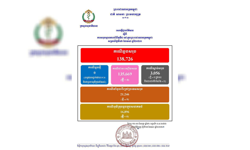 គួរបញ្ជាក់ថា នៅក្នុង សេចក្ដីជូនដំណឹងរបស់ក្រសួងសុខាភិបាល នៅថ្ងៃទី១៦ ខែមេសា ឆ្នាំ ២០២៣ គ្មានអ្នកឆ្លង ថ្មី , គ្មា នអ្នកជាសះស្បើយ និងអ្នកជំងឺស្លាប់ គ្មាន ៖