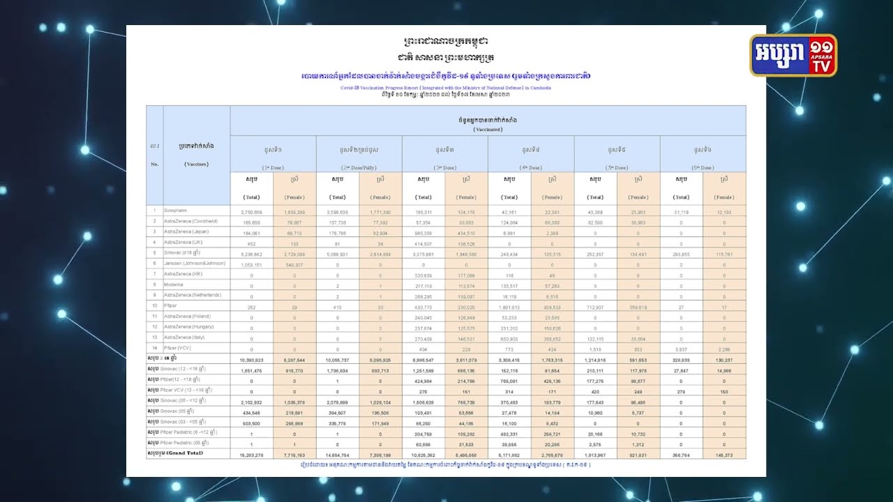 កម្ពុជាបានចាប់ផ្តើមចាក់ដូសជំរុញទី៦ ចាប់តាំងពីដើមខែមករា ដែលរហូតមកទល់ពេលនេះ មានពលរដ្ឋទៅចាក់បានចំនួន ៣៥ម៉ឺន ៦ពាន់ ៧៦៤នាក់ហើយ។ ដោយឡែកតួលេខ នៃការចាក់វ៉ាក់សាំងដូសមូលដ្ឋានទូទាំងប្រទេសកម្ពុជាមានជិត ៩៦ភាគរយ។