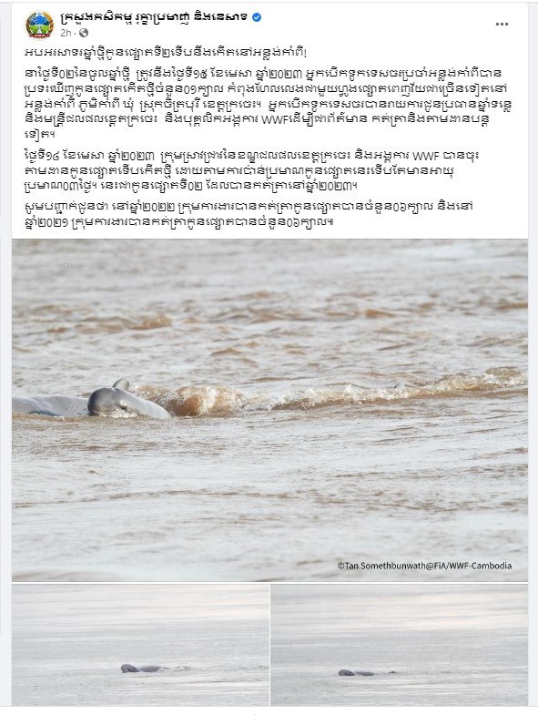 ភ្នំពេញ៖ បើតាមក្រសួងកសិកម្ម រុក្ខាប្រមាញ់ និងនេសាទ បានឱ្យដឹងនៅថ្ងៃទី១៨ ខែមេសា ឆ្នាំ២០២៣ ថា នាថ្ងៃទី២ នៃពិធីបុណ្យចូលឆ្នាំប្រពៃណីជាតិខ្មែរ ត្រូវនឹងថ្ងៃទី១៥ ខែមេសា ឆ្នាំ២០២៣ អ្នកបើកទូកទេសចរ ប្រចាំតំបន់អន្លង់កាំពី បានប្រទះឃើញកូនផ្សោតកើតថ្មី ១ក្បាល កំពុងហែលទឹកលេង ជាមួយហ្វូងផ្សោតពេញវ័យ ជាច្រើនទៀត នៅអន្លង់កាំពី ភូមិកាំពី ឃុំ ស្រុកចិត្របុរី ខេត្តក្រចេះ ។