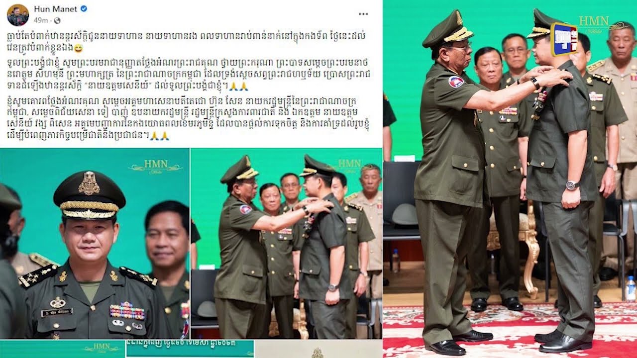 បណ្ឌិត ហ៊ុន ម៉ាណែត បានសរសេរក្នុងបណ្តាញសង្គមរបស់លោកថ្វាយព្រះមហាក្សត្រខ្មែរថា «ទូលព្រះបង្គំជាខ្ញុំ សូមព្រះបរមរាជានុញ្ញាតថ្លែងអំណរ ព្រះរាជគុណ ថ្វាយព្រះករុណា ព្រះបាទសម្តេចព្រះបរមនាថ នរោត្តម សីហមុនី ព្រះមហាក្សត្រ នៃព្រះរាជាណាចក្រកម្ពុជា ដែលទ្រង់ស្តេចសព្វព្រះរាជហឬទ័យ ប្រោសព្រះរាជទានដំឡើងឋានន្តរស័ក្តិ “នាយឧត្តមសេនីយ៍” ដល់ទូលព្រះបង្គំជាខ្ញុំ»។