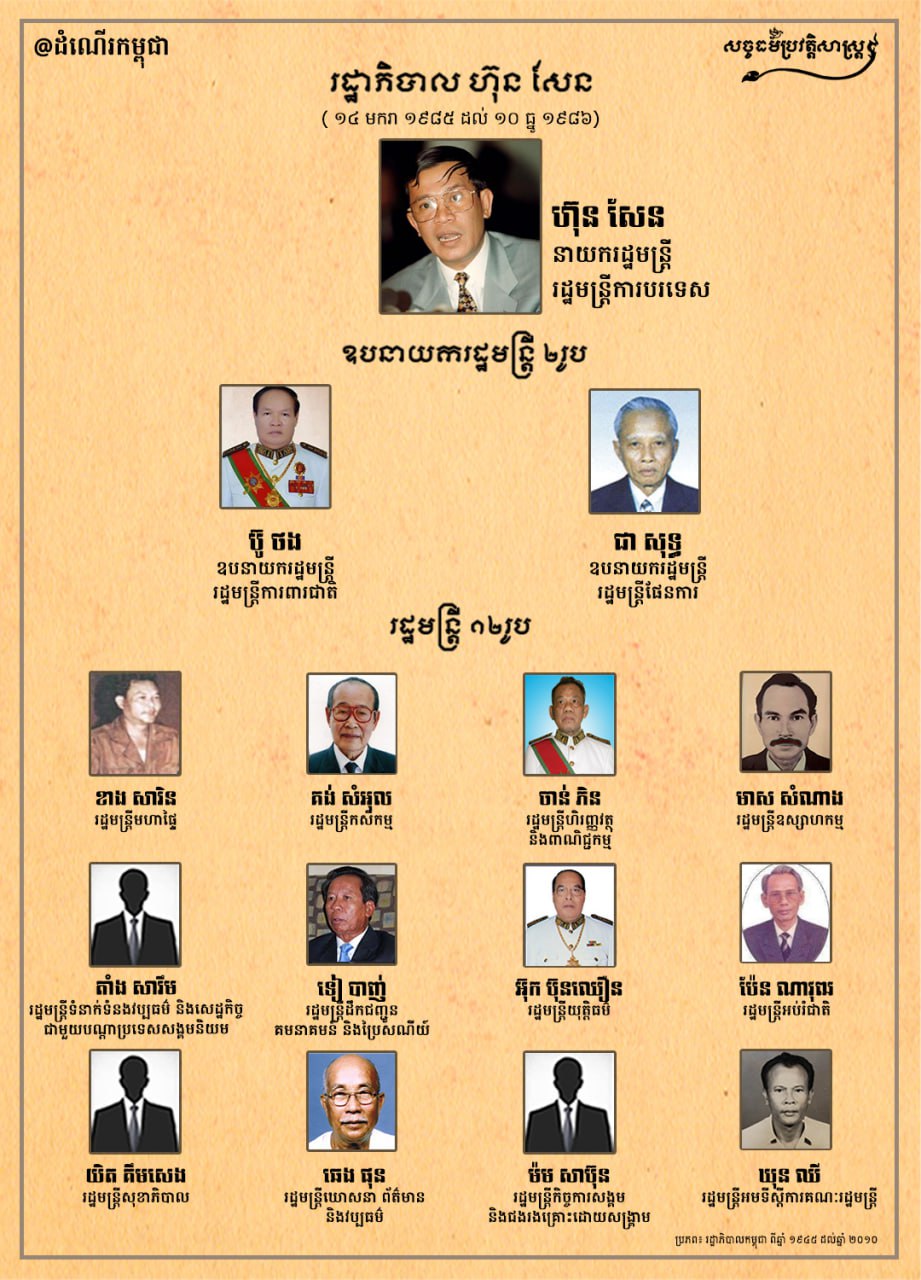 សម្ដេចតេជោ ហ៊ុន សែន បានឡើងកាន់តំណែងជានាយករដ្ឋមន្ត្រីលើកដំបូងនៅឆ្នាំ១៩៨៥ ជាពេលដែលកម្ពុជាកំពុងមានវិបត្តិនៅឡើយ ហើយថ្ងៃនេះសច្ចធម៌ប្រវត្តិសាស្ដ្រសូមលើកយក រដ្ឋាភិបាល ហ៊ុន សែន ថ្ងៃទី១៤ ខែមករា ឆ្នាំ១៩៨៥ ដល់ ថ្ងៃទិ១០ ខែធ្នូឆ្នាំ១៩៨៦ ដែលមានសមាសភាពដូចតទៅនេះ៖