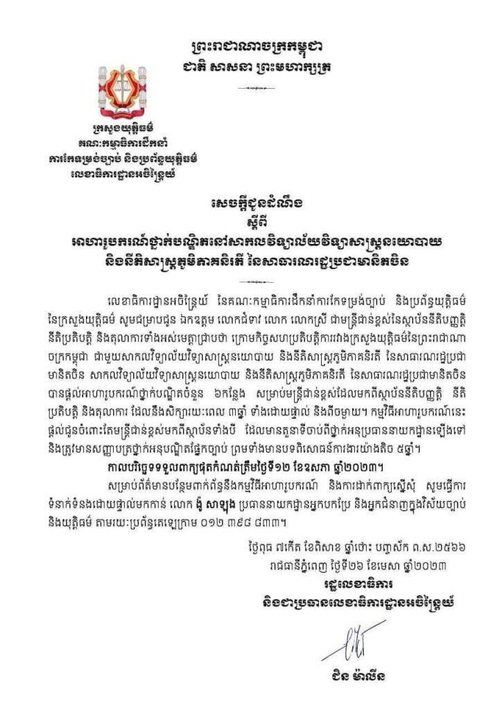ភ្នំពេញ៖ សាកលវិទ្យាល័យវិទ្យាសាស្ត្រនយោបាយនិងនីតិសាស្ត្រភូមិភាគនិរតីនៃសាធារណរដ្ឋប្រជាមានិតចិន បានប្រកាសផ្តល់អាហារូបរណ៍ដល់មន្រ្តីជាន់ខ្ពស់នៃក្រសួងយុត្តិធម៌កម្ពុជា សម្រាប់សិក្សាថ្នាក់បណ្ឌិត ទាំងដោយផ្ទាល់ និងពីចម្ងាយ។ នេះបើតាមសេចក្តីជូនដំណឹងរបស់ក្រសួងយុត្តិធម៌ ចេញផ្សាយកាលពីយប់ថ្ងៃទី២៦ ខែ មេសា ឆ្នាំ២០២៣។
