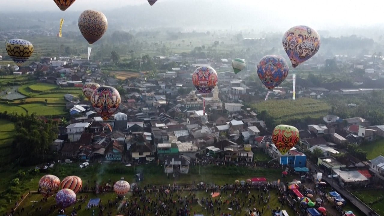 ផ្ទៃមេឃក្នុងតំបន់ Wonosobo នៅឯកោះជ្វារបស់ប្រទេសឥណ្ឌូណេស៊ី ពោរពេញទៅដោយបាឡុងខ្យល់ចម្រុះពណ៌ដ៏ស្រស់ស្អាត។