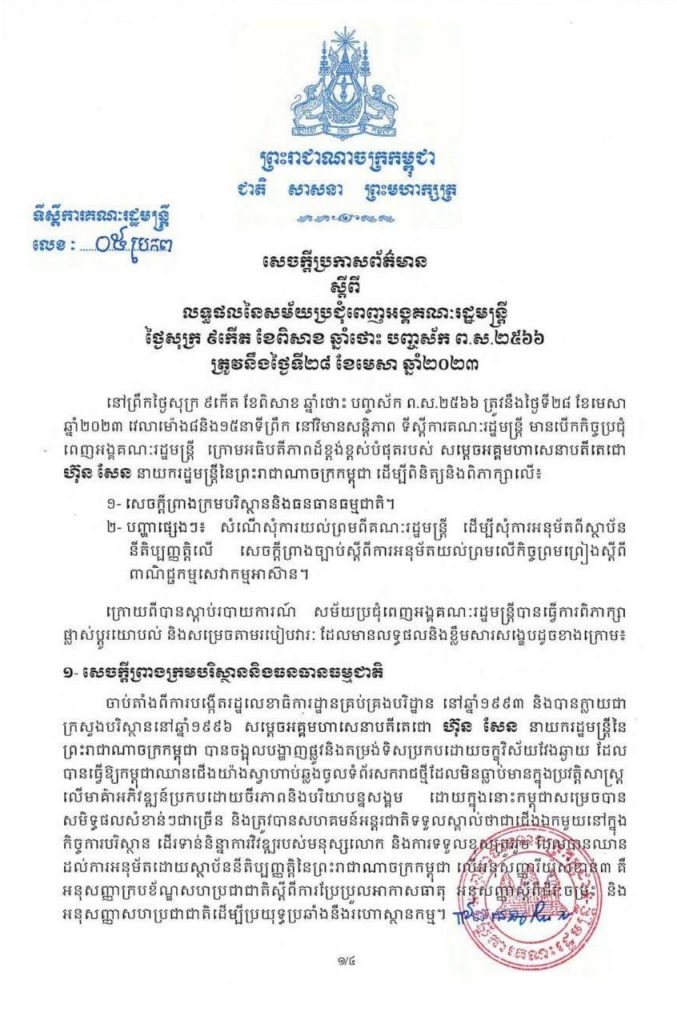 លទ្ធផលកិច្ចប្រជុំពេញអង្គគណៈរដ្ឋមន្ដ្រីនៅថ្ងៃទី២៨ មេសា ២០២៣One-Minuteអត្ថបទដោយ៖AMS OneMinute #ams1minute AMS OneMinuteអត្ថបទមុនអត្ថបទបន្ទាប់