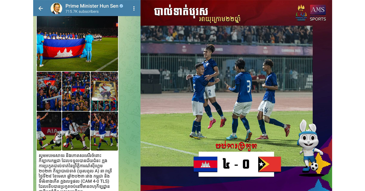ភ្នំពេញ៖ សម្ដេចតេជោ ហ៊ុន សែន នាយករដ្ឋមន្ត្រីកម្ពុជា បានអបអរសាទរ និងកោតសរសើរចំពោះកីឡាករកម្ពុជា ដែលទទួលបានជ័យជំនះ ក្នុងការប្រកួតបាល់ទាត់នៃព្រឹត្តិការណ៍ស៊ីហ្គេម ២០២៣ កីឡាបាល់ទាត់ (បុរសពូល A) នារាត្រីថ្ងៃទី២៩ ខែមេសា ឆ្នាំ២០២៣ រវាងកម្ពុជា និងទីម័រខាងកើត ក្នុងលទ្ធផល ៤-០ (CAM 4-0 TLS) ដែលបានប្រកួតចប់នៅ វិមានពហុកីឡដ្ឋានជាតិអូឡាំពិក ។