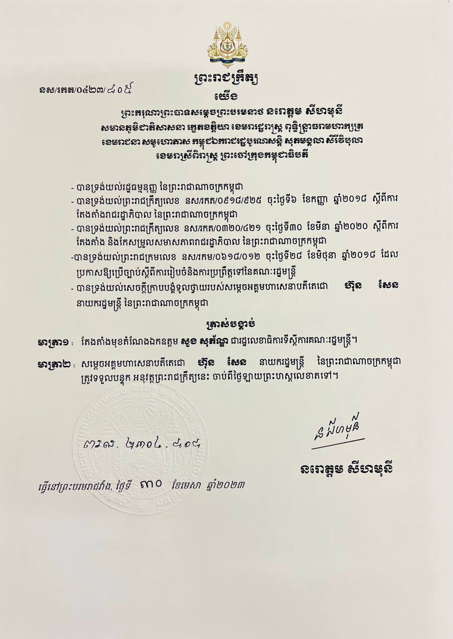 ក្នុងនាមរាជរដ្ឋាភិបាល ខ្ញុំនឹងស្នើសុំព្រះមហាក្សត្រចេញព្រះរាជក្រឹត្យ
