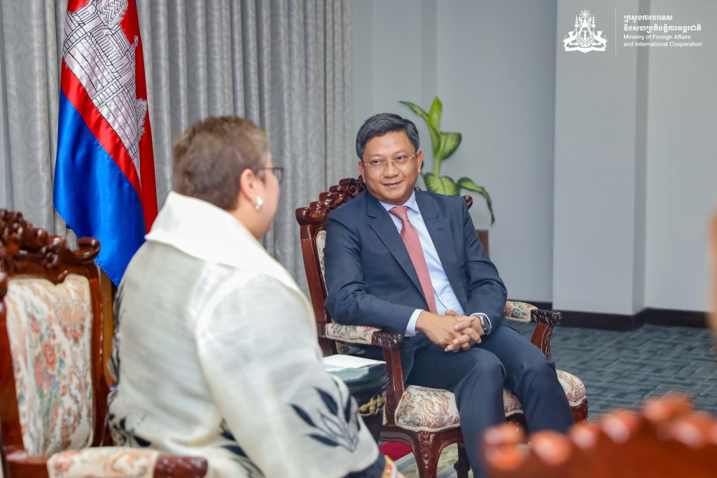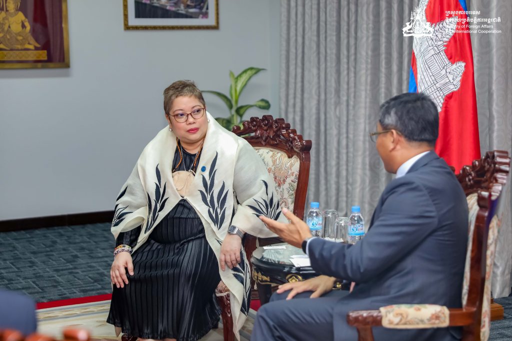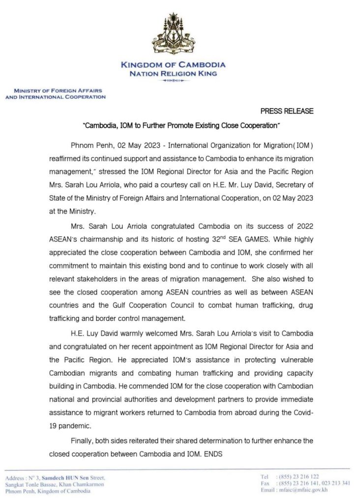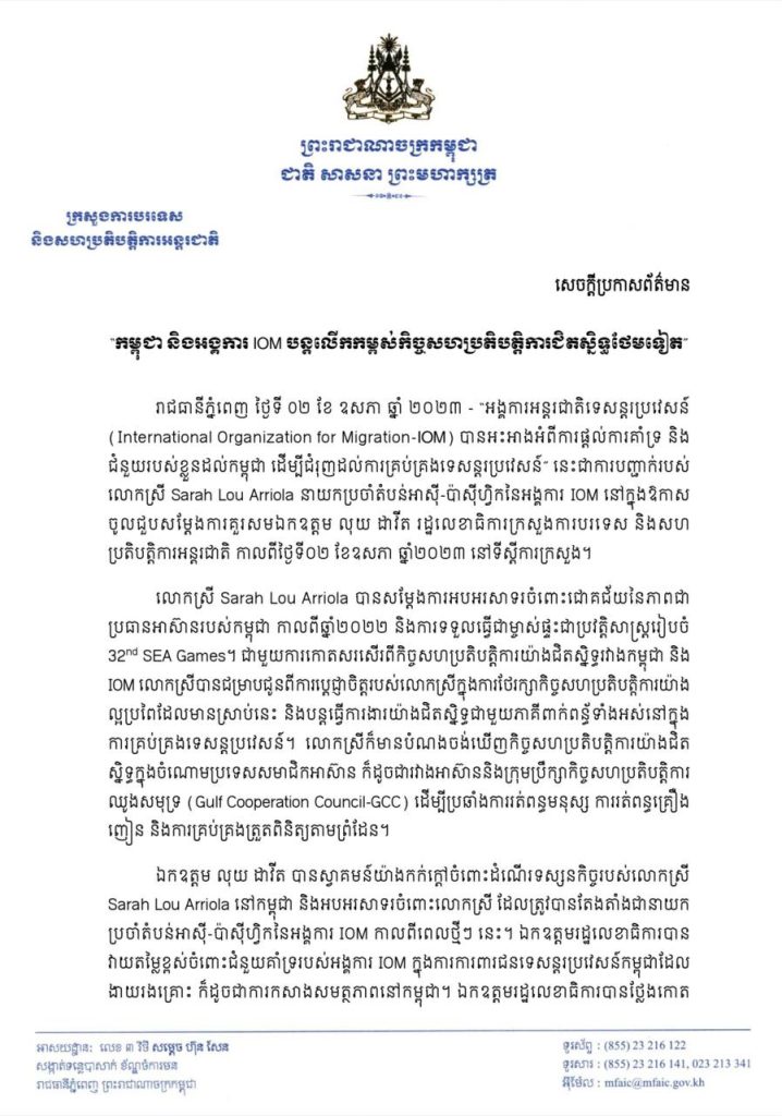 ភ្នំពេញ៖ “អង្គការអន្តរជាតិទេសន្តរប្រវេសន៍ (International Organization for Migration-IOM) បានអះអាងអំពីការផ្តល់ការគាំទ្រ និងជំនួយរបស់ខ្លួនដល់កម្ពុជា ដើម្បីជំរុញដល់ការគ្រប់គ្រងទេសន្តរប្រវេសន៍” នេះជាការបញ្ជាក់របស់លោកស្រី Sarah Lou Arriola នាយកប្រចាំតំបន់អាស៊ី-ប៉ាស៊ីហ្វិកនៃអង្គការ IOM នៅក្នុងឱកាសចូលជួបសម្តែងការគួរសមឯកឧត្តម លុយ ដាវីត រដ្ឋលេខាធិការក្រសួងការបរទេស និងសហប្រតិបត្តិការអន្តរជាតិ កាលពីថ្ងៃទី០២ ខែឧសភា ឆ្នាំ២០២៣ នៅទីស្តីការក្រសួង។