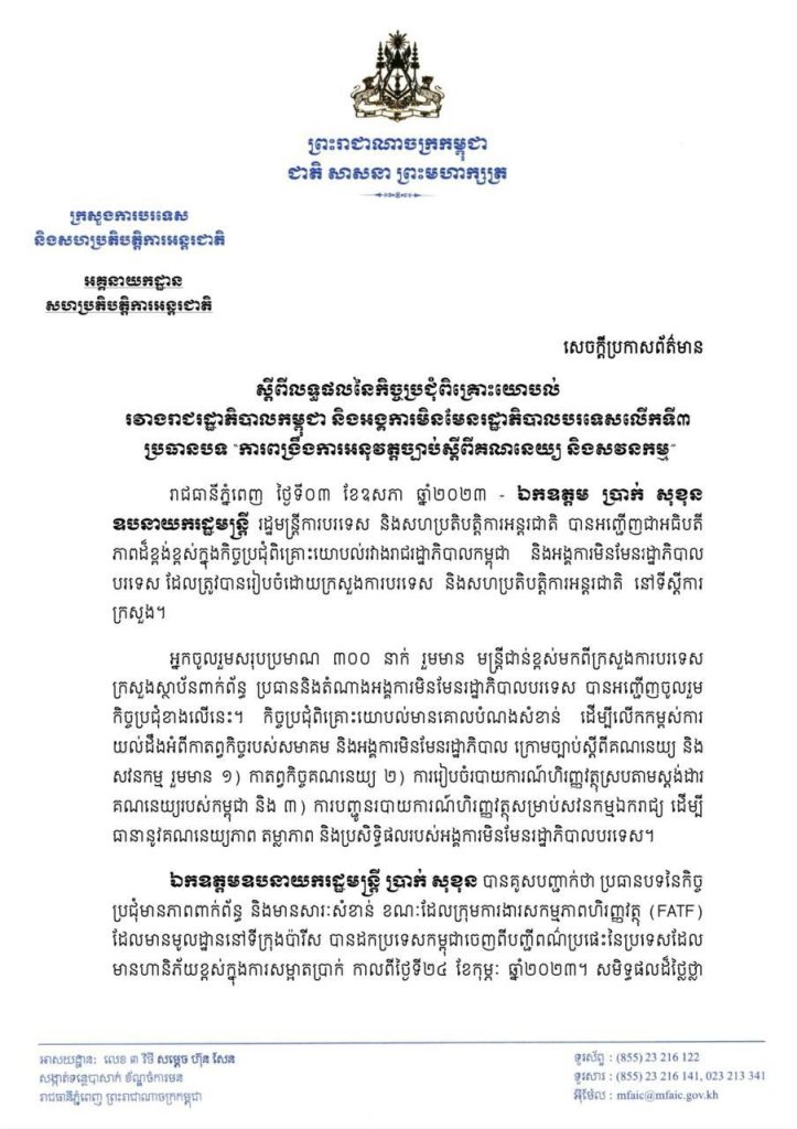 ឯកឧត្តមឧបនាយករដ្ឋមន្ត្រី ប្រាក់ សុខុន បានគូសបញ្ជាក់ថា ប្រធានបទនៃកិច្ចប្រជុំមានភាពពាក់ព័ន្ធ និងមានសារៈសំខាន់ ខណៈដែលក្រុមការងារសកម្មភាពហិរញ្ញវត្ថុ (FATF) ដែលមានមូលដ្ឋាននៅទីក្រុងប៉ារីស បានដកប្រទេសកម្ពុជាចេញពីបញ្ជីពណ៌ប្រផេះនៃប្រទេសដែលមានហានិភ័យខ្ពស់ក្នុងការសម្អាតប្រាក់ កាលពីថ្ងៃទី២៤ ខែកុម្ភៈ ឆ្នាំ២០២៣។ សមិទ្ធផលដ៏ថ្លៃថ្លានេះអាចធ្វើទៅបាន ដោយមានការប្តេជ្ញាចិត្តយ៉ាងមុតមាំរបស់រាជរដ្ឋាភិបាល និងអ្នកពាក់ព័ន្ធទាំងអស់ រួមទាំងអង្គការមិនមែនរដ្ឋាភិបាលបរទេសដែលជាអង្គភាពរាយការណ៍។