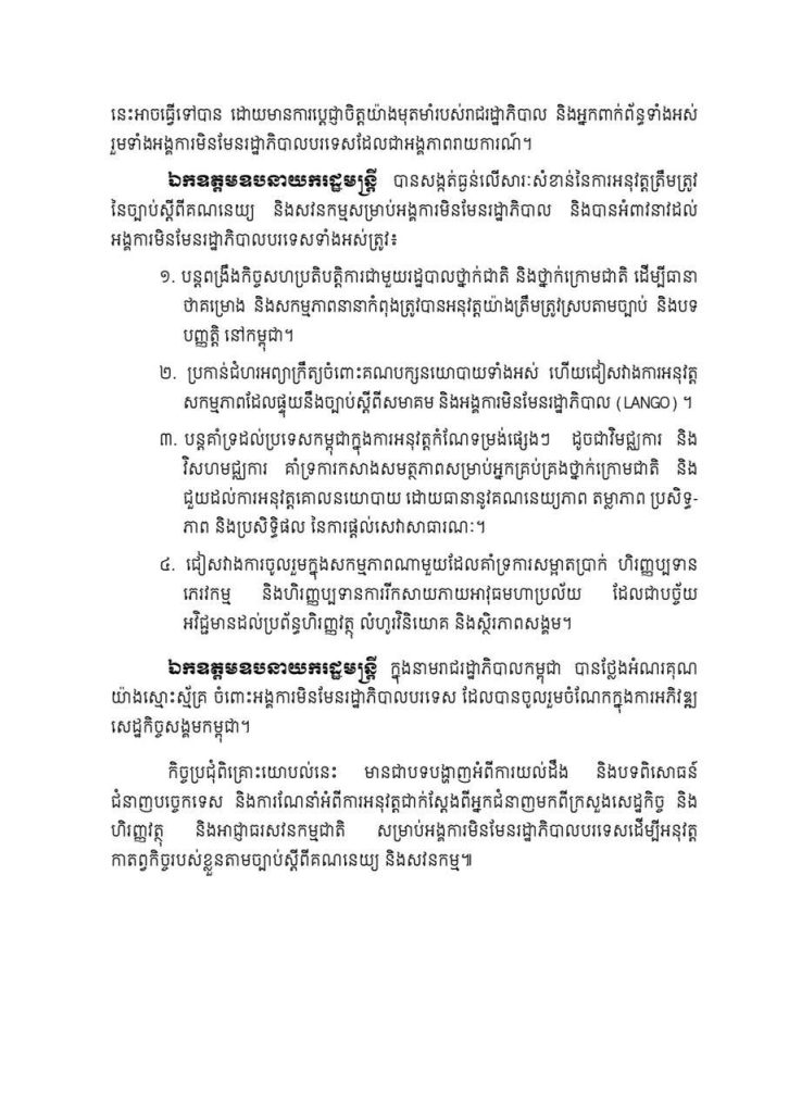 ឯកឧត្តមឧបនាយករដ្ឋមន្ត្រី ក្នុងនាមរាជរដ្ឋាភិបាលកម្ពុជា បានថ្លែងអំណរគុណយ៉ាងស្មោះស្ម័គ្រ ចំពោះអង្គការមិនមែនរដ្ឋាភិបាលបរទេស ដែលបានចូលរួមចំណែកក្នុងការអភិវឌ្ឍសេដ្ឋកិច្ចសង្គមកម្ពុជា។