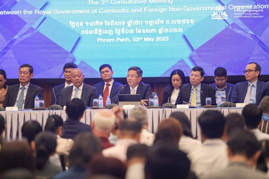ភ្នំពេញ៖ ឯកឧត្តម ប្រាក់ សុខុន ឧបនាយករដ្ឋមន្ត្រី រដ្ឋមន្ត្រីការបរទេស និងសហប្រតិបត្តិការអន្តរជាតិ បានអញ្ជើញជាអធិបតីភាពដ៏ខ្ពង់ខ្ពស់ក្នុងកិច្ចប្រជុំពិគ្រោះយោបល់រវាងរាជរដ្ឋាភិបាលកម្ពុជា និងអង្គការមិនមែនរដ្ឋាភិបាល បរទេស ដែលត្រូវបានរៀបចំដោយក្រសួងការបរទេស និងសហប្រតិបត្តិការអន្តរជាតិ នៅទីស្តីការក្រសួង នាថ្ងៃទី០៣ ខែឧសភា ឆ្នាំ២០២៣ ។ អ្នកចូលរួមសរុបប្រមាណ ៣០០ នាក់ រួមមាន៖ មន្រ្តីជាន់ខ្ពស់មកពីក្រសួងការបរទេស ក្រសួងស្ថាប័នពាក់ព័ន្ធ ប្រធាននិងតំណាងអង្គការមិនមែនរដ្ឋាភិបាលបរទេស បានអញ្ជើញចូលរួមកិច្ចប្រជុំខាងលើនេះ។