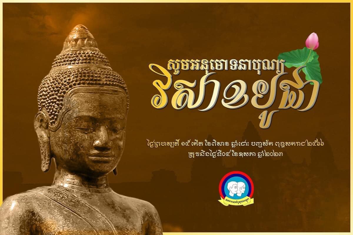 សូមអនុមោទនា ពិធីបុណ្យវិសាខបូជា ថ្ងៃព្រហស្បតិ៍ ១៥កើត ខែពិសាខ ឆ្នាំថោះ បញ្ចស័ក ពុទ្ធសករាជ ២៥៦៦ ឈានចូល ២៥៦៧ ត្រូវនឹងថ្ងៃទី៤ ឧសភា ២០២៣