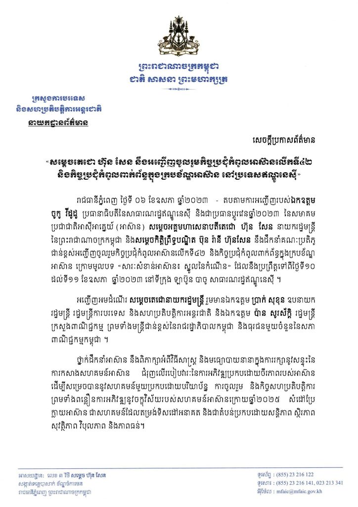ភ្នំពេញ៖ តបតាមការអញ្ជើញរបស់ឯកឧត្តម ចូកូ វីដូដូ ប្រធានាធិបតីនៃសាធារណរដ្ឋឥណ្ឌូនេស៊ី និងជាប្រធានប្តូរវេនឆ្នាំ២០២៣ នៃសមាគមប្រជាជាតិអាស៊ីអាគ្នេយ៍ (អាស៊ាន) សម្តេចអគ្គមហាសេនាបតីតេជោ ហ៊ុន សែន នាយករដ្ឋមន្រ្តី នៃព្រះរាជាណាចក្រកម្ពុជា និងសម្តេចកិត្តិព្រឹទ្ធបណ្ឌិត ប៊ុន រ៉ានី ហ៊ុនសែន នឹងដឹកនាំគណៈប្រតិភូជាន់ខ្ពស់ អញ្ជើញចូលរួមកិច្ចប្រជុំកំពូលអាស៊ានលើកទី៤២ និងកិច្ចប្រជុំកំពូលពាក់ព័ន្ធក្នុងក្របខ័ណ្ឌអាស៊ាន ក្រោមមូលបទ «សារៈសំខាន់អាស៊ាន៖ ស្នូលនៃកំណើន» ដែលនឹងប្រព្រឹត្តទៅពីថ្ងៃទី១០ ដល់ទី១១ ខែឧសភា ឆ្នាំ២០២៣ នៅទីក្រុង ឡាប៊ូន បាចូ សាធារណរដ្ឋឥណ្ឌូនេស៊ី។