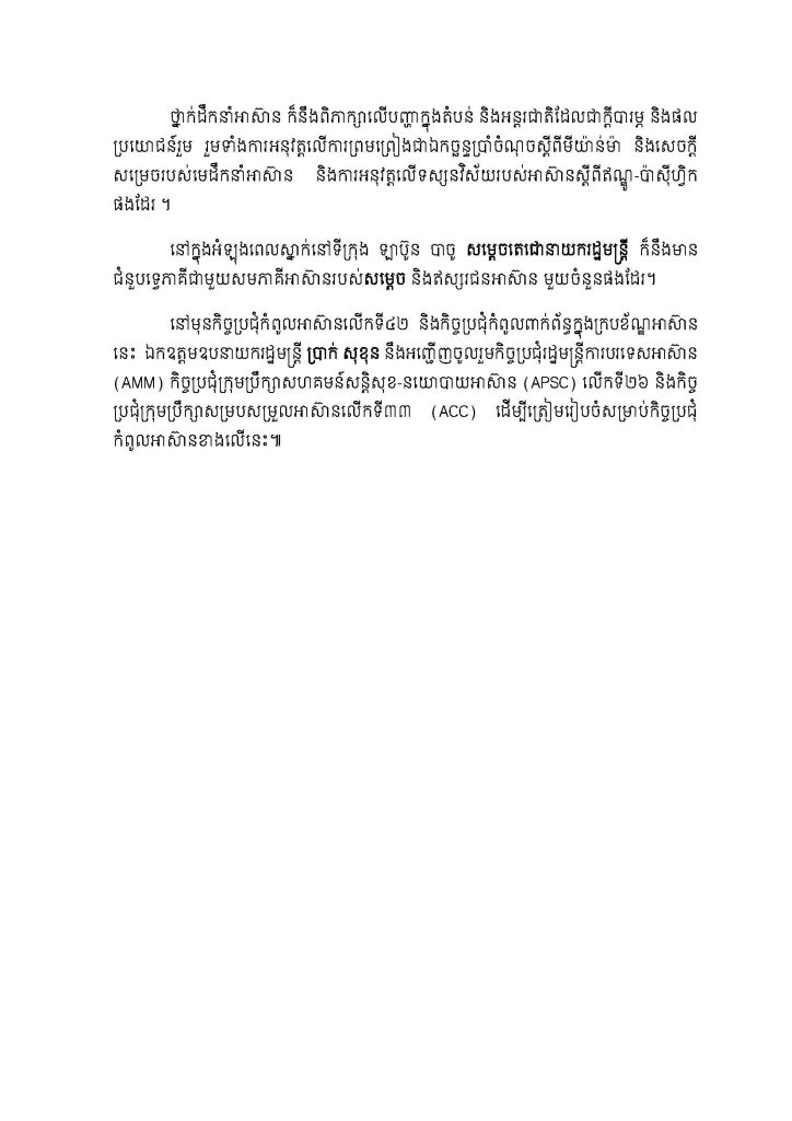 នៅមុនកិច្ចប្រជុំកំពូលអាស៊ានលើកទី៤២ និងកិច្ចប្រជុំកំពូលពាក់ព័ន្ធក្នុងក្របខ័ណ្ឌអាស៊ាននេះ ឯកឧត្តមឧបនាយករដ្ឋមន្ត្រី ប្រាក់ សុខុន នឹងអញ្ជើញចូលរួមកិច្ចប្រជុំរដ្ឋមន្ត្រីការបរទេសអាស៊ាន (AMM) កិច្ចប្រជុំក្រុមប្រឹក្សាសហគមន៍សន្តិសុខ-នយោបាយអាស៊ាន (APSC) លើកទី២៦ និងកិច្ចប្រជុំ ក្រុមប្រឹក្សាសម្របសម្រួលអាស៊ានលើកទី៣៣ (ACC) ដើម្បីត្រៀមរៀបចំសម្រាប់ កិច្ចប្រជុំកំពូលអាស៊ានខាងលើនេះ៕