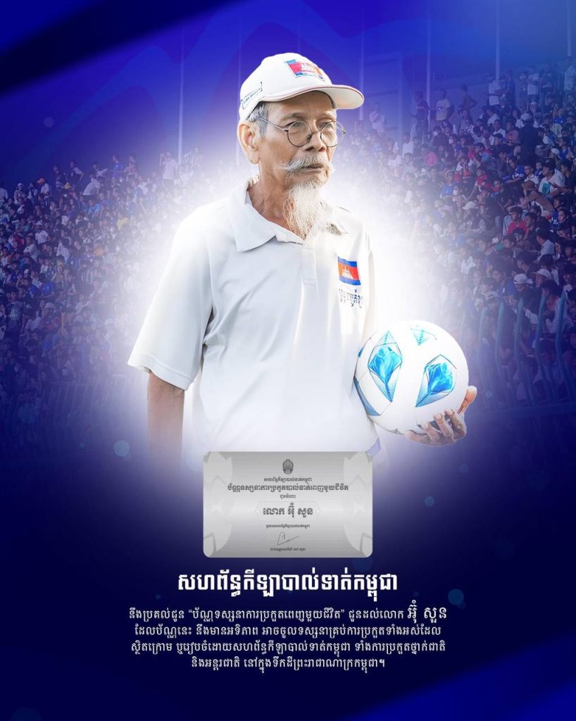 សហព័ន្ធកីឡាបាល់ទាត់កម្ពុជា នឹងប្រគល់ជូន “ប័ណ្ណទស្សនាការប្រកួតពេញមួយជីវិត” ជូនដល់លោក អ៊ុ សួន ដែលជាអ្នកស្នេហាកីឡាបាល់ទាត់កម្ពុជា ជាយូរអង្វែងមកហើយ