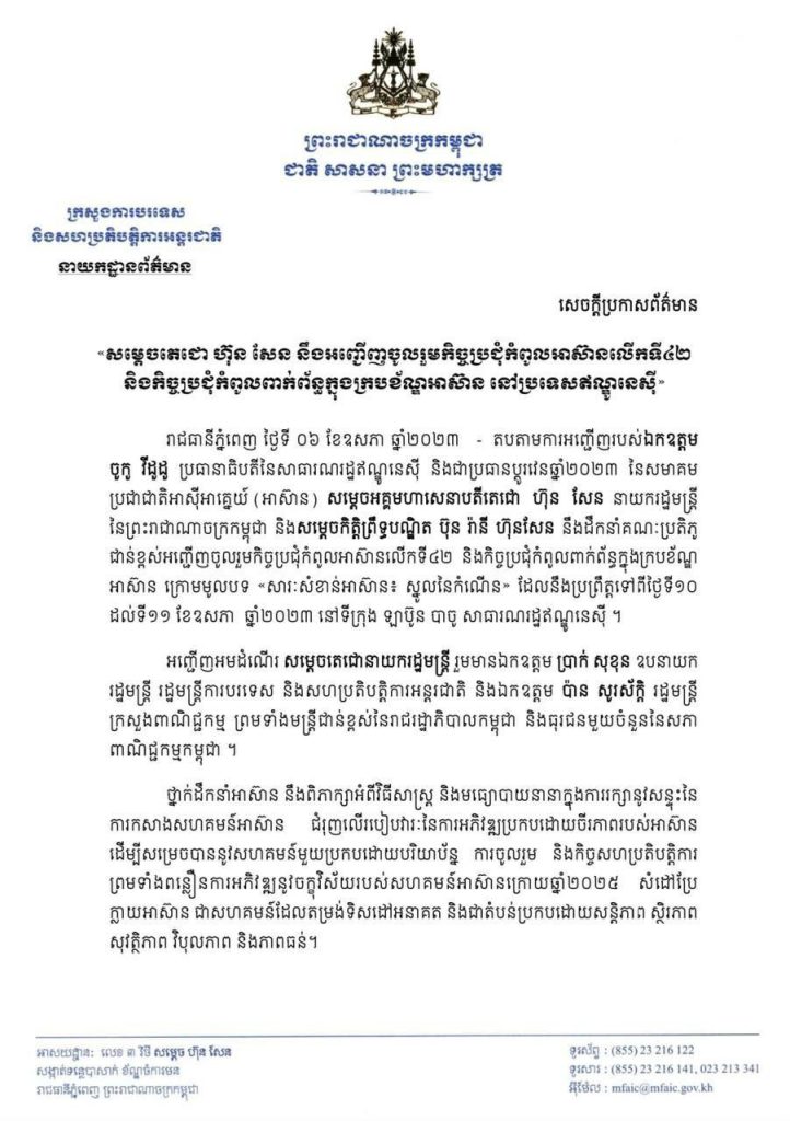 យោងតាមសេចក្តីប្រកាសព័ត៌មានរបស់ក្រសួងការបរទេស និងសហប្រតិ បត្តិការអន្តរជាតិនៅថ្ងៃទី៧ ខែឧសភា ឆ្នាំ២០២៣ បានឱ្យដឹងថា តប តាមការអញ្ជើញរបស់ឯកឧត្តម ចូកូ វីដូដូ ប្រធានាធិបតីនៃសាធារណ រដ្ឋឥណ្ឌូនេស៊ី និងជាប្រធានប្តូរវេនឆ្នាំ២០២៣ នៃសមាគម ប្រជាជាតិ អាស៊ីអាគ្នេយ៍ (អាស៊ាន) សម្តេចអគ្គមហាសេនាបតីតេជោ ហ៊ុន សែន នាយករដ្ឋមន្តី នៃព្រះរាជាណាចក្រកម្ពុជា និងសម្តេចកិត្តិព្រឹទ្ធបណ្ឌិត ប៊ុន រ៉ានី ហ៊ុនសែន នឹងដឹកនាំគណៈប្រតិភូ ជាន់ខ្ពស់អញ្ជើញចូលរួមកិច្ចប្រជុំកំពូល អាស៊ានលើកទី៤២ និងកិច្ចប្រជុំកំពូលពាក់ព័ន្ធក្នុងក្របខ័ណ្ឌ អាស៊ាន ក្រោមមូលបទ «សារៈសំខាន់អាស៊ាន៖ ស្នូលនៃកំណើន» ដែលនឹងប្រព្រឹត្ត ទៅពីថ្ងៃទី១០ ដល់ទី១១ ខែឧសភា ឆ្នាំ២០២៣ នៅទីក្រុង ឡាប៊ូន បាចូ សាធារណរដ្ឋឥណ្ឌូនេស៊ី ។
