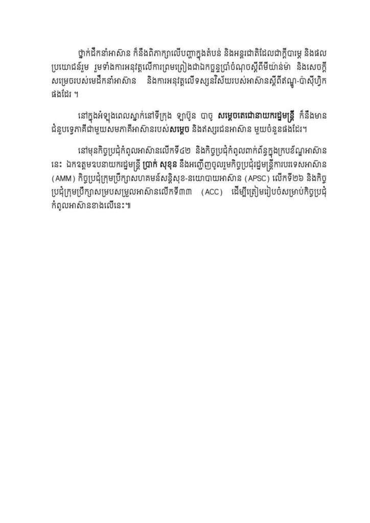 នៅមុនកិច្ចប្រជុំកំពូលអាស៊ានលើកទី៤២ និងកិច្ចប្រជុំកំពូលពាក់ព័ន្ធក្នុង ក្របខ័ណ្ឌអាស៊ាន នេះ ឯកឧត្តមឧបនាយករដ្ឋមន្ត្រី ប្រាក់ សុខុន នឹង អញ្ជើញចូលរួមកិច្ចប្រជុំរដ្ឋមន្ត្រីការបរទេសអាស៊ាន (AMM) កិច្ចប្រជុំ ក្រុមប្រឹក្សាសហគមន៍សន្តិសុខ-នយោបាយអាស៊ាន (APSC) លើកទី២៦ និងកិច្ច ប្រជុំក្រុមប្រឹក្សាសម្របសម្រួលអាស៊ានលើកទី៣៣ (ACC) ដើម្បីត្រៀមរៀបចំសម្រាប់កិច្ចប្រជុំ កំពូលអាស៊ានខាងលើនេះ៕