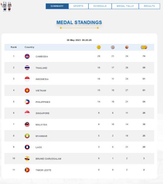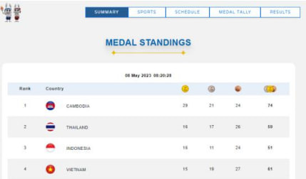 គិតត្រឹមម៉ោង ៨៖២០នាទីព្រឹកថ្ងៃ៨ ឧសភា កម្ពុជាបន្ដឈរលេខរៀងទី១ ទទួលមេដាយច្រើនជាងគេសរុប ៧៤គ្រឿង ក្នុងនោះមាសចំនួន ២៩ ប្រាក់ចំនួន ២១ និងសំរិទ្ធចំនួន ២៤One-Minuteអត្ថបទដោយ៖AMS OneMinute #ams1minute AMS OneMinuteអត្ថបទមុនអត្ថបទបន្ទាប់