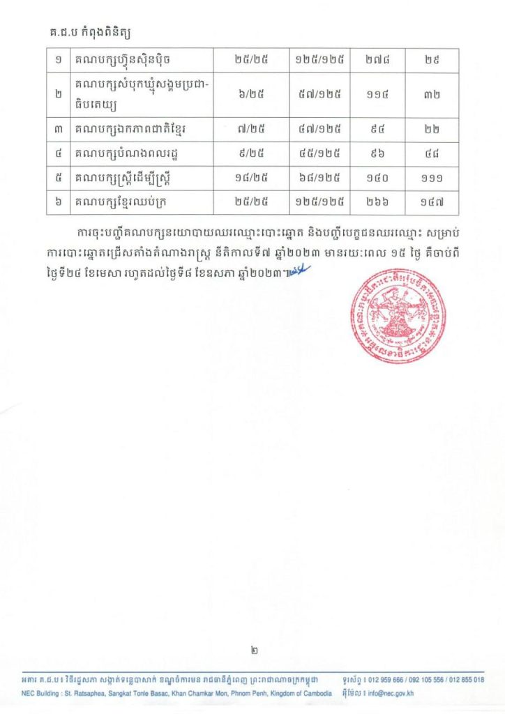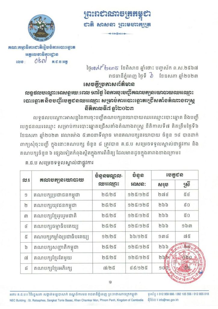 សេចក្តីប្រកាសព័ត៌មានលទ្ធផលបណ្ដោះអាសន្នរយៈពេល ១៣ថ្ងៃ នៃការចុះបញ្ជីគណបក្សនយោបាយឈរឈ្មោះបោះឆ្នោត និងបញ្ជីបេក្ខជនឈរឈ្មោះ សម្រាប់ការបោះឆ្នោតជ្រើសតាំងតំណាងរាស្រ្ត នីតិកាលទី៧ ឆ្នាំ២០២៣