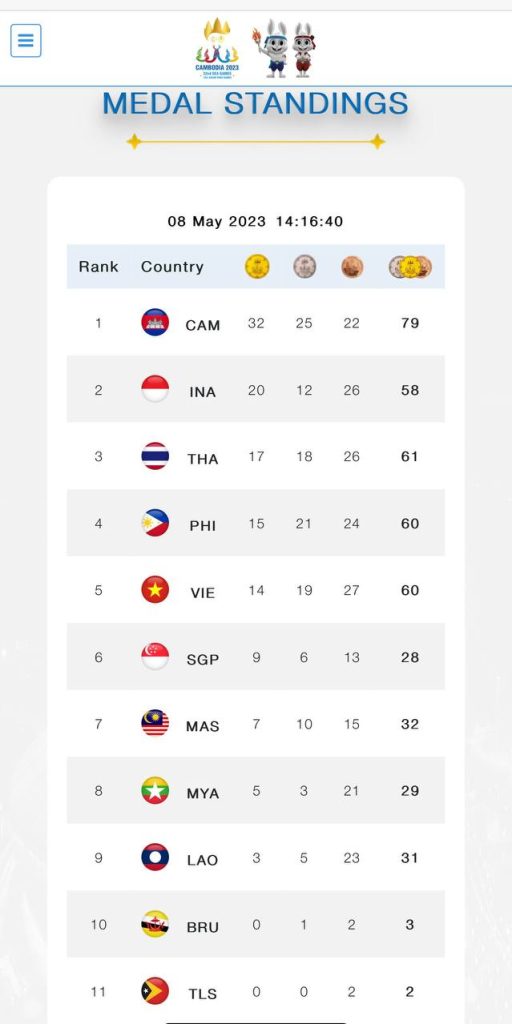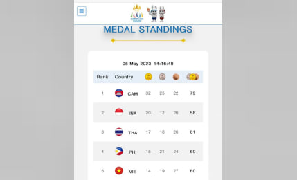 គិតត្រឹមម៉ោង ២៖១៥នាទីរសៀលថ្ងៃទី៨ ឧសភា កម្ពុជាបន្ដឈរលេខរៀងទី១ ទទួលមេដាយច្រើនជាងគេ សរុប ៧៩គ្រឿង ក្នុងនោះមាសចំនួន ៣២ ប្រាក់ចំនួន ២៥ និងសំរិទ្ធចំនួន ២២One-Minuteអត្ថបទដោយ៖AMS OneMinute #ams1minute AMS OneMinuteអត្ថបទមុនអត្ថបទបន្ទាប់