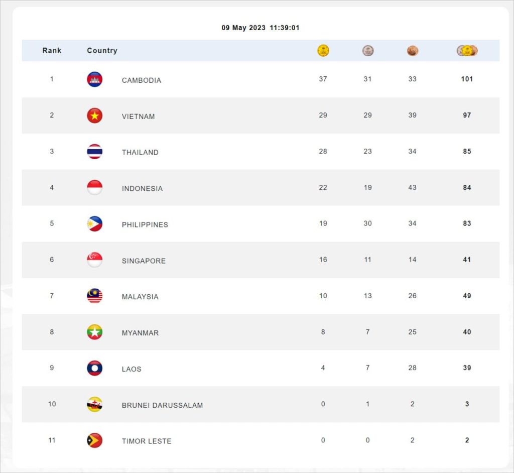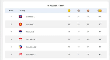 គិតត្រឹមម៉ោង១១៖៣៩នាទីព្រឹកនេះ កម្ពុជាបន្ដឈរលេខរៀងទី១ ទទួលមេដាយច្រើនជាងគេ ១០១គ្រឿង ក្នុងនោះមាសចំនួន៣៧, ប្រាក់ចំនួន៣១ និងសំរិទ្ធចំនួន៣៣One-Minuteអត្ថបទដោយ៖AMS OneMinute #ams1minute AMS OneMinuteអត្ថបទមុនអត្ថបទបន្ទាប់