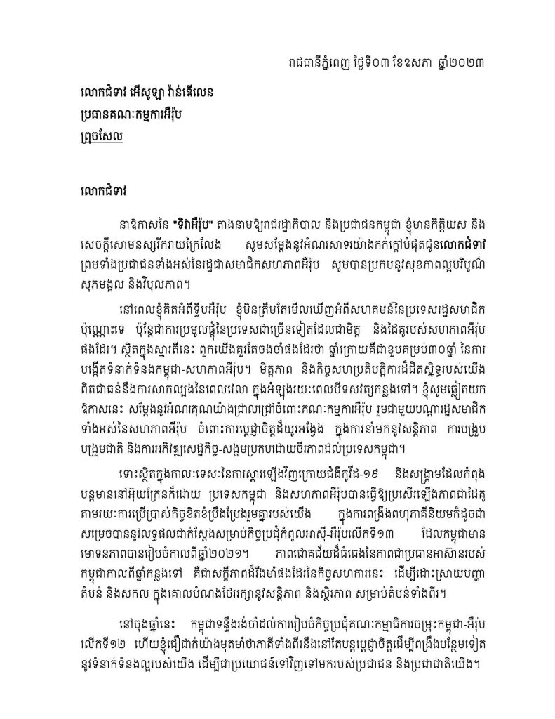 សម្តេចសូមឆ្លៀតយក ឱកាសនេះ សម្តែងនូវអំណរគុណយ៉ាងជ្រាលជ្រៅចំពោះគណៈកម្មការអឺរ៉ុប រួមជាមួយបណ្តារដ្ឋសមាជិក ទាំងអស់នៃសហភាពអឺរ៉ុប ចំពោះការប្តេជ្ញាចិត្តដ៏យូរអង្វែង ក្នុងការនាំមកនូវសន្តិភាព ការបង្រួបបង្រួមជាតិ និងការអភិវឌ្ឍសេដ្ឋកិច្ច-សង្គមប្រកបដោយចីរភាពដល់ប្រទេសកម្ពុជា។ ទោះស្ថិតក្នុងកាលៈទេសៈនៃការស្តារឡើងវិញក្រោយជំងឺកូវីដ-១៩ និងសង្រ្គាមដែលកំពុង បន្តមាននៅអ៊ុយក្រែនក៏ដោយ ប្រទេសកម្ពុជា និងសហភាពអឺរ៉ុបបានធ្វើឱ្យប្រសើរឡើងភាពជាដៃគូ តាមរយៈការប្រើប្រាស់កិច្ចខិតខំប្រឹងប្រែងរួមគ្នារបស់យើង ក្នុងការពង្រឹងពហុភាគីនិយមក៏ដូចជា សម្រេចបាននូវលទ្ធផលជាក់ស្តែងសម្រាប់កិច្ចប្រជុំកំពូលអាស៊ី-អឺរ៉ុបលើកទី១៣ ដែលកម្ពុជាមានមោទនភាពបានរៀបចំកាលពីឆ្នាំ២០២១។ ភាពជោគជ័យដ៏ធំធេងនៃភាពជាប្រធានអាស៊ានរបស់កម្ពុជាកាលពីឆ្នាំកន្លងទៅ គឺជាសក្ខីភាពដ៏រឹងមាំផងដែរនៃកិច្ចសហការនេះ ដើម្បីដោះស្រាយបញ្ហា តំបន់ និងសកល ក្នុងគោលបំណងថែររក្សានូវសន្តិភាព និងស្ថិរភាព សម្រាប់តំបន់ទាំងពីរ។