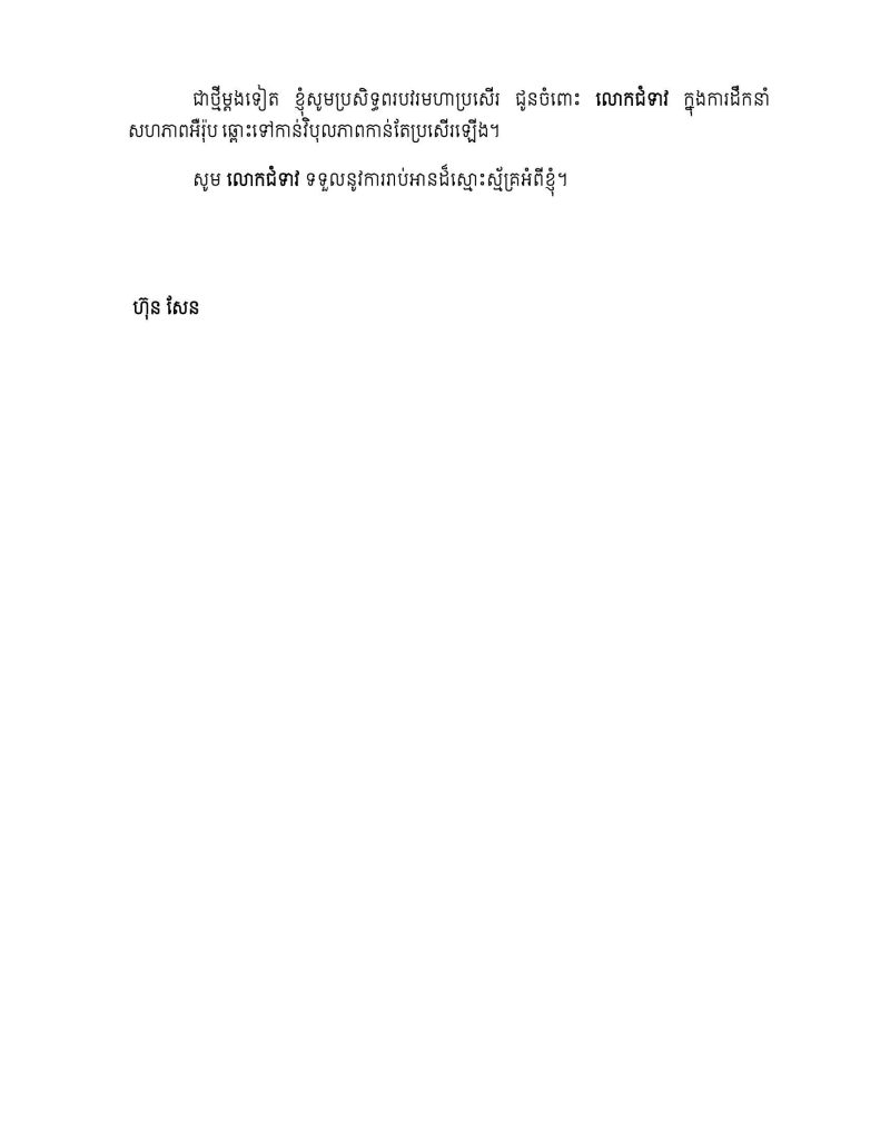 សម្តេចតេជោ ហ៊ុន សែន បានបន្តថា នៅចុងឆ្នាំនេះ កម្ពុជាទន្ទឹងរង់ចំាដល់ការរៀបចំកិច្ចប្រជុំគណៈកម្មាធិការចម្រុះកម្ពុជា-អឺរ៉ុប លើកទី១២ ហើយខ្ញុំជឿជាក់យ៉ាងមុតមាំថាភាគីទាំងពីរនឹងនៅតែបន្តប្តេជ្ញាចិត្តដើម្បីពង្រឹងបន្ថែមទៀត នូវទំនាក់ទំនងល្អរបស់យើង ដើម្បីជាប្រយោជន៍ទៅវិញទៅមករបស់ប្រជាជន និងប្រជាជាតិយើង។ ជាថ្មីម្តងទៀត សម្តេចតេជោ ហ៊ុន សែន សូមប្រសិទ្ធពរបវរមហាប្រសើរ ជូនចំពោះ លោកជំទាវ ក្នុងការដឹកនាំ សហភាពអឺរ៉ុបឆ្ពោះទៅកាន់វិបុលភាពកាន់តែប្រសើរឡើង៕