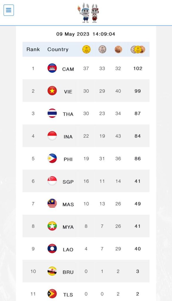 គិតត្រឹមម៉ោង២៖០៩នាទីរសៀលថ្ងៃនេះ កម្ពុជាបន្ដឈរលេខរៀងទី១ ទទួលមេដាយច្រើនជាងគេ ១០២គ្រឿង ក្នុងនោះមាសចំនួន៣៧, ប្រាក់ចំនួន៣៣ ននិងសំរិទ្ធចំនួន៣២One-Minuteអត្ថបទដោយ៖AMS OneMinute #ams1minute AMS OneMinuteអត្ថបទមុនអត្ថបទបន្ទាប់