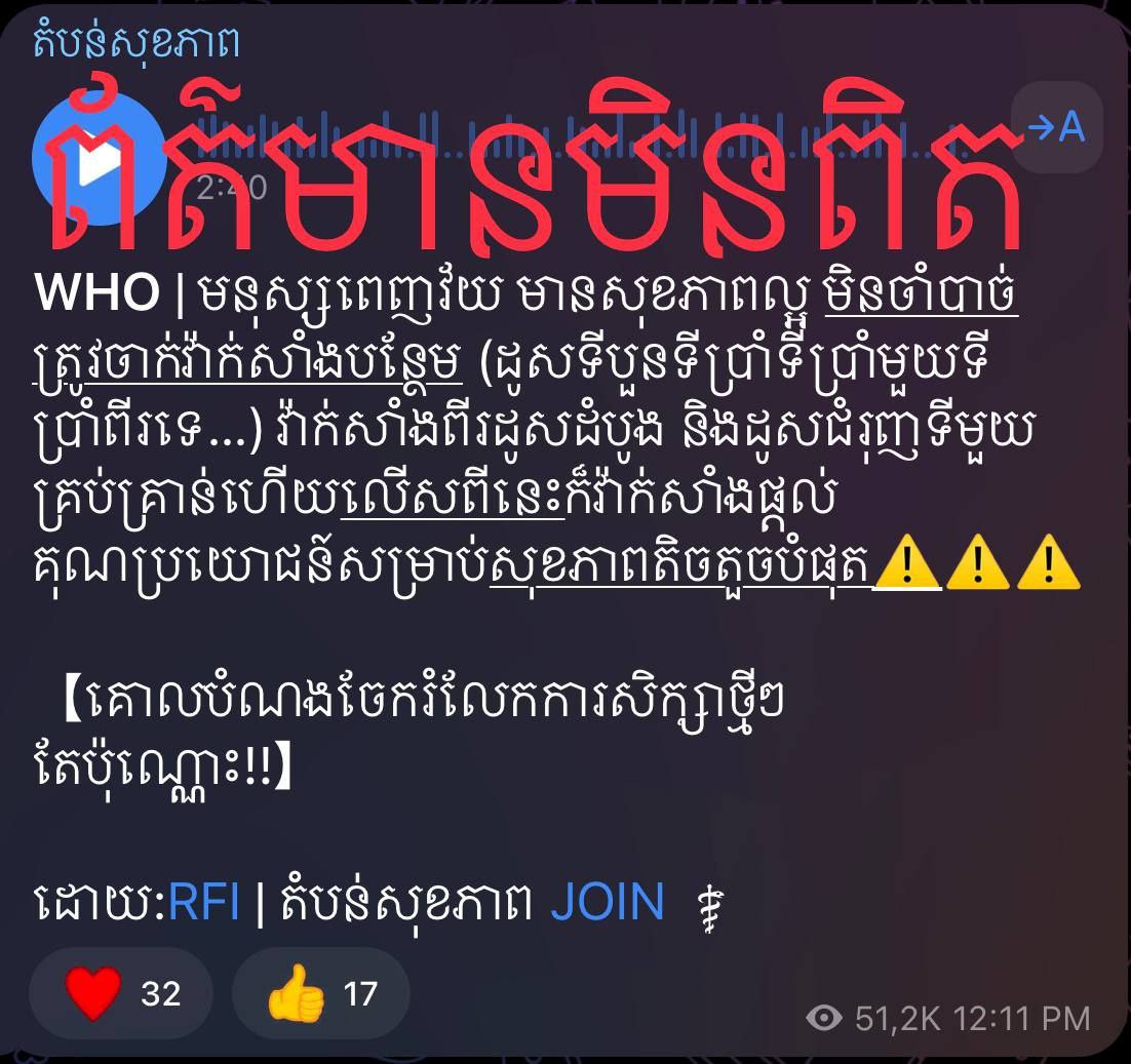 លោកជំទាវ ឱ វណ្ណឌីន អ្នកនាំពាក្យក្រសួងសុខាភិបាលនៅថ្ងៃទី៩ ខែឧសភា បានឱ្យដឹងថា មានបណ្ដាញតេលេក្រាមមួយឈ្មោះថា«តំបន់សុខភាព»បានផ្សព្វផ្សាយសារសម្លេងរបស់ស្ថាប័នសារព័ត៌មានមួយដែលមានរយៈពេលជិតបីនាទីទាក់ទងនឹងអង្គការសុខភាពពិភពលោក(WHO)ថា មនុស្សពេញវ័យមានសុខភាពល្អ មិនចាំបាច់ត្រូវចាក់វ៉ាក់សាំងបន្ថែមនោះឡើយ។