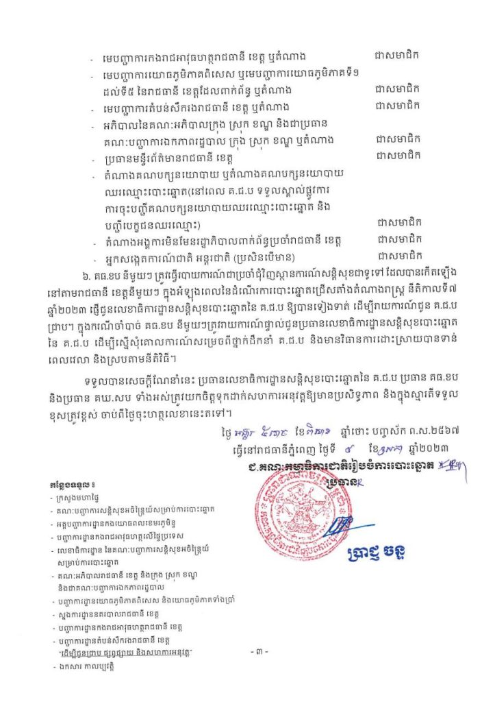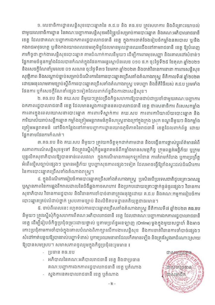 (ភ្នំពេញ)៖ គណៈកម្មាធិការជាតិរៀបចំការបោះឆ្នោត (គ.ជ.ប) បានចេញសេចក្ដីណែនាំស្ដីពី កិច្ចសហការការងារសន្តិសុខ សុវត្ថិភាព និងសណ្ដាប់ធ្នាប់សាធារណៈ សម្រាប់ដំណើរការបោះឆ្នោតជ្រើសតាំងតំណាងរាស្ត្រ នីតិកាលទី៧ ឆ្នាំ២០២៣ ថ្ងៃអាទិត្យ ទី២៣ ខែកក្កដា ឆ្នាំ២០២៣ ៕