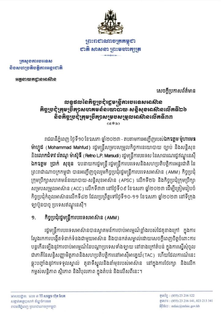ភ្នំពេញ ៖ ថ្ងៃទី១០ ខែឧសភា ឆ្នាំ២០២៣ តបតាមការអញ្ជើញរបស់ឯកឧត្តម ម៉ូហាមេឌ ម៉ាហ្វូដ (Mohammad Mahfud) រដ្ឋមន្ត្រីសម្របសម្រួលកិច្ចការនយោបាយ ច្បាប់ និងសន្តិសុខ និងលោកជំទាវ រ៉េតណូ ម៉ាស៊ូឌី (Retro LP. Marsudi) រដ្ឋមន្ត្រីការបរទេស នៃសាធារណរដ្ឋឥណ្ឌូនេស៊ី ឯកឧត្តម ប្រាក់ សុខុន ឧបនាយករដ្ឋមន្ត្រី រដ្ឋមន្ត្រីការបរទេសនិងសហប្រតិបត្តិការអន្តរជាតិ ន ព្រះរាជាណាចក្រកម្ពុជា បានអញ្ជើញចូលរួមកិច្ចប្រជុំរដ្ឋមន្ត្រីការបរទេសអាស៊ាន (AMM) កិច្ចប្រជុំ ក្រុមប្រឹក្សាសហគមន៍នយោបាយ-សន្តិសុខអាស៊ាន (APSC) លើកទី២៦ និងកិច្ចប្រជុំក្រុមប្រឹក្សា សម្របសម្រួលអាស៊ាន (ACC) លើកទី៣៣ នៅថ្ងៃទី០៩ ខែឧសភា ឆ្នាំ២០២៣ ដើម្បីត្រៀមរៀបចំ កិច្ចប្រជុំកំពូលអាស៊ានលើកទី៤២ ដែលប្រព្រឹត្តទៅថ្ងៃទី១០-១១ ខែឧសភា ឆ្នាំ២០២៣ នៅទីក្រុង ឡាប៊ួនបាចូ ប្រទេសឥណ្ឌូនេស៊ី។