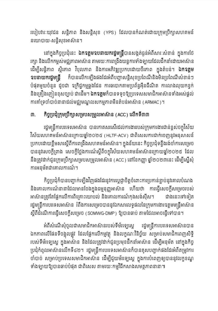 លទ្ធផល នៃកិច្ចប្រជុំរដ្ឋមន្រ្តីការបរទេសអាស៊ាន កិច្ចប្រជុំក្រុមប្រឹក្សាសហគមន៍នយោបាយ-សន្តិសុខអាស៊ានលើកទី២៦ និងកិច្ចប្រជុំក្រុមប្រឹក្សាសម្របសម្រួលអាស៊ានលើកទី៣៣