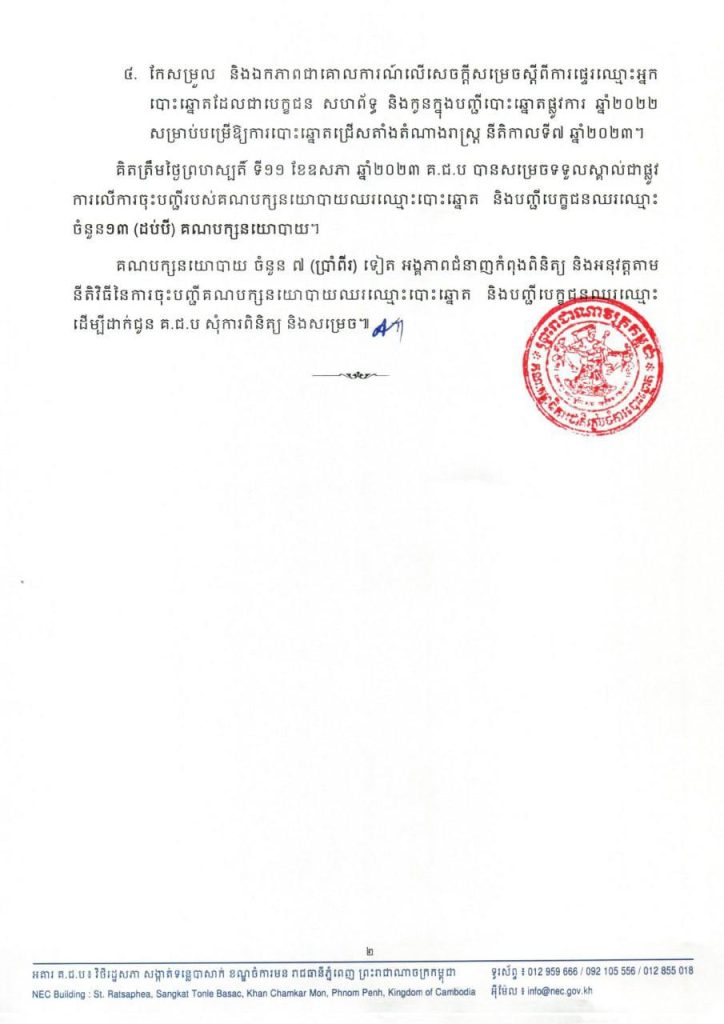 អង្គប្រជុំ គ.ជ.ប បានសម្រេចទទួលស្គាល់ជាផ្លូវការលើពាក្យសុំចុះបញ្ជីរបស់គណបក្សចំនួន២បន្ថែមទៀត៖ ទី១-គណបក្សឯកភាពជាតិខ្មែរ ដែលមាន៧មណ្ឌលរាជធានី-ខេត្ត និងទី២-គណបក្សប្រជាធិបតេយ្យមូលដ្ឋាន ដែលមាន១២មណ្ឌលរាជធានី-ខេត្ត និងបញ្ជីបេក្ខជនឈរឈ្មោះបោះឆ្នោតរបស់បក្សទាំង២នេះ ក្នុងការបោះឆ្នោតជ្រើសតាំងតំណាងរាស្ត្រ នីតិកាលទី៧ ឆ្នាំ២០២៣។