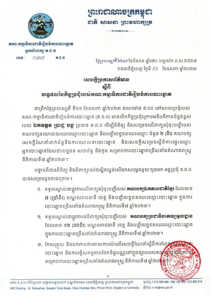 យោងតាមសេចក្តីប្រកាសព័ត៌មានដែលចេញផ្សាយនាថ្ងៃទី១១ ខែឧសភានេះ គ.ជ.ប បានបើកកិច្ចប្រជុំក្រោមវត្តមានឯកឧត្តម ប្រាជ្ញ ចន្ទ ប្រធាន គ.ជ.ប ដើម្បីពិនិត្យ និងសម្រេចលើពាក្យសុំចុះបញ្ជីរបស់គណបក្សនយោបាយឈរឈ្មោះបោះឆ្នោត និងបញ្ជីបេក្ខជនឈរឈ្មោះចំនួន២គណបក្ស។